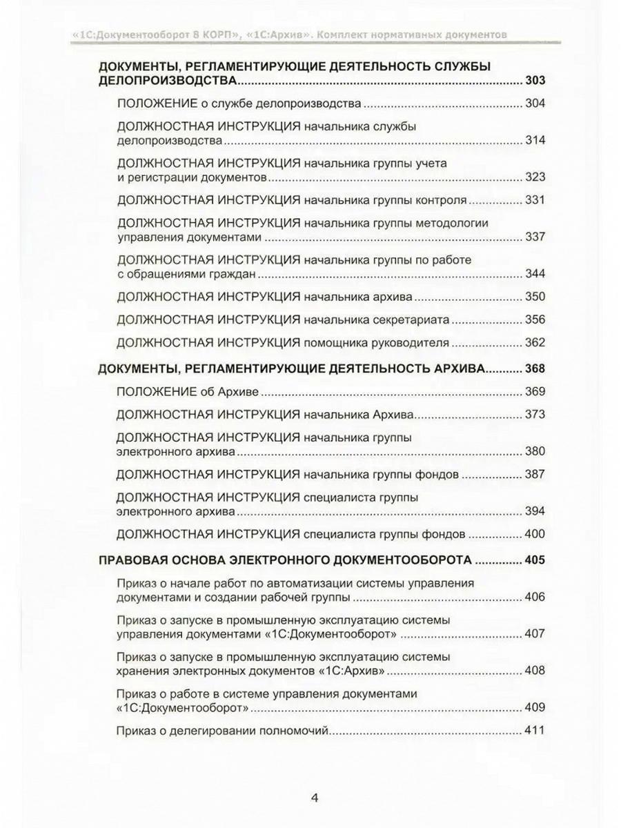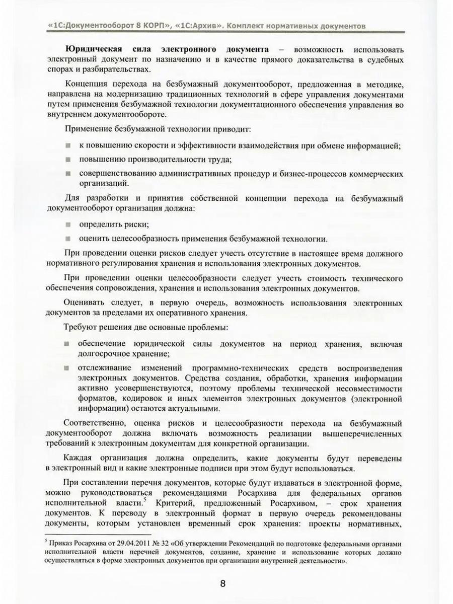 В издании рассматривается методика постановки делопроизводства и совместной работы сотрудников на базе программ «1С:Документооборот 8 КОРП» и «1С:Архив». В книге содержится печатный комплект типовых нормативных документов для постановки делопроизводства и архива. Читателям также предлагается доступ к электронным версиям этих документов (ссылка во введении) - их можно использовать при внедрении системы автоматизации на базе программы «1С:Документооборот 8 КОРП» и системы хранения документов на базе программы «1С:Архив» в организации - приобретателе настоящего издания. Издание учитывает специфику документирования деятельности в различных хозяйствующих субъектах - обществах с ограниченной ответственностью и акционерных обществах. Пособие рассчитано на документоведов - организаторов документационного обеспечения управления, архивистов, управляющих документацией, перед которыми стоит задача внедрения системы электронного документооборота и системы хранения электронных документов, консультантов в области автоматизации документооборота, специалистов-управленцев, а также партнеров фирмы «1С», оказывающих услуги по внедрению программ «1С:Документооборот 8 КОРП» и «1С:Архив».| Издательство | 1С-Паблишинг |