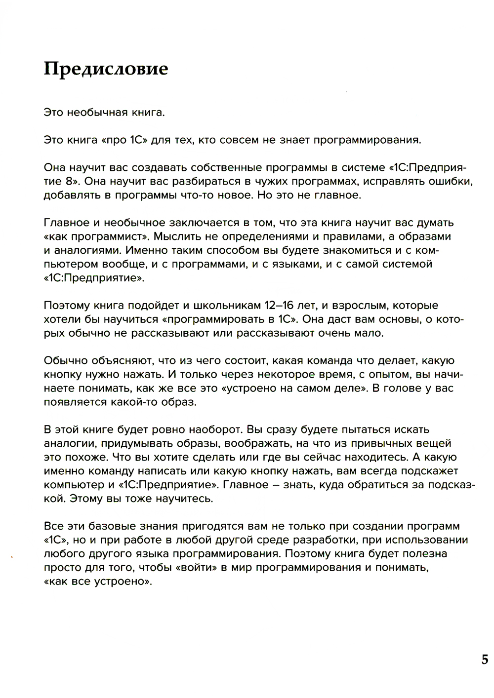 Книга адресована читателям, которые совсем не знают программирования, но хотят научиться создавать собственные программы в системе «1С: Предприятие 8». Она подойдет и школьникам 12-16 лет, и взрослым, которые хотели бы научиться «программировать в 1С». В книге рассматривается практический пример создания простого прикладного решения. Он позволяет освоить базовые понятия и базовые приемы программирования, научиться использовать среду разработки (конфигуратор), овладеть встроенным языком и языком запросов, познакомиться с устройством базы данных, приобрести навыки отладки прикладных решений. Книга содержит большое количество рисунков и примеров кода на встроенном языке, снабженных подробными комментариями. Кроме этого после многих ключевых разделов даются задания для самостоятельной работы, ответы на эти задания содержатся в конце книги. Для создания демонстрационных примеров использована учебная версия платформы 8.3.8.1933. Для самостоятельного выполнения этих примеров требуется доступ к Интернету, чтобы скачать (бесплатно) учебную версию платформы и демонстрационные конфигурации.| Издательство | 1С-Паблишинг |