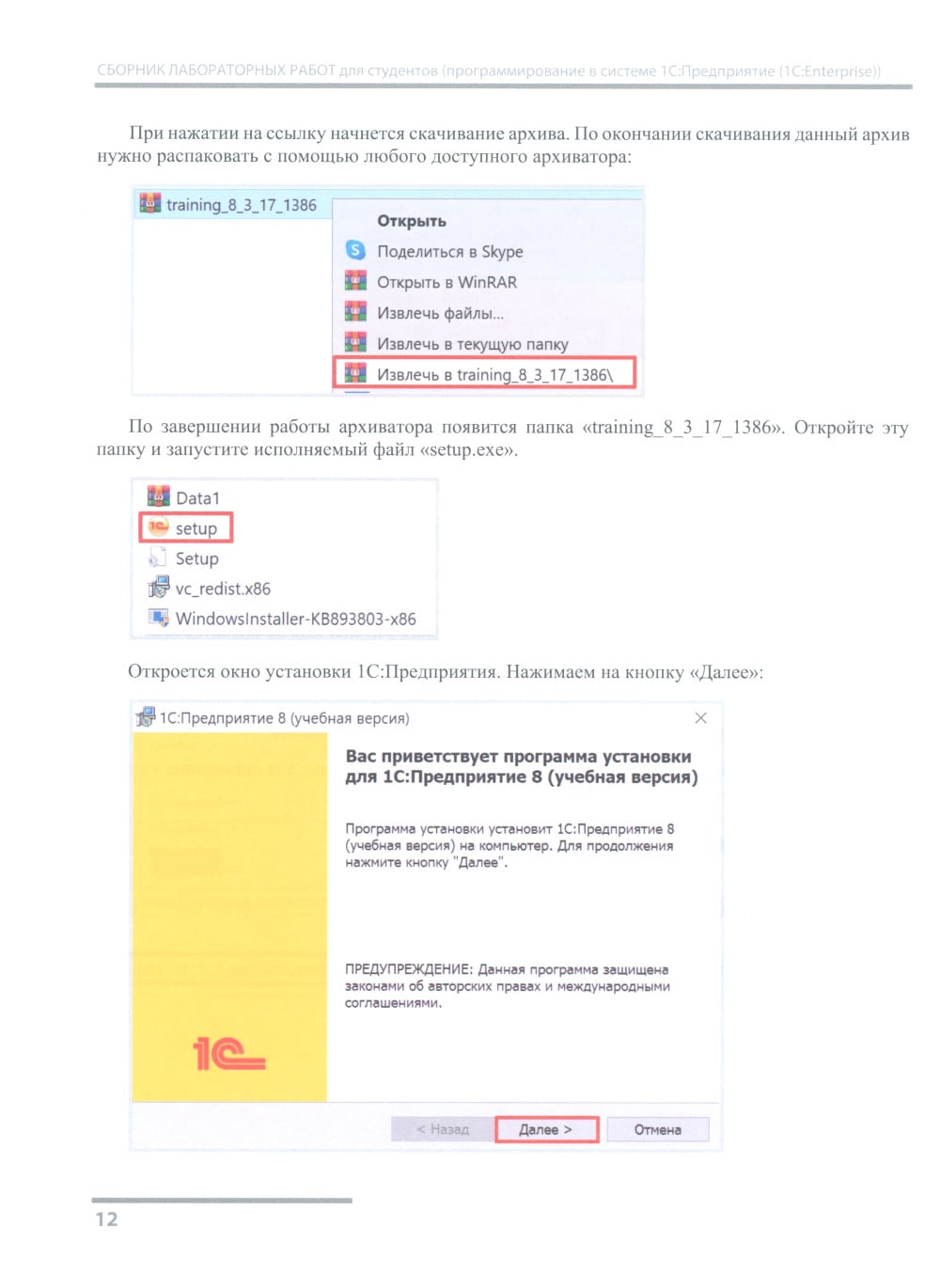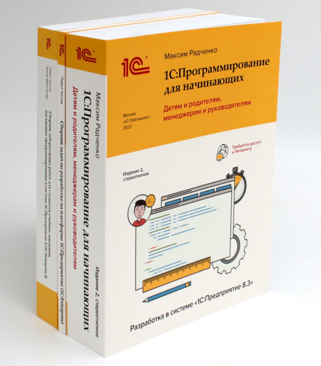 Комплект содержит книги: «1С: Программирование для начинающих. Детям и родителям, менеджерам и руководителям. Разработка в системе " 1С: Предприятие 8.3"» Книга адресована читателям, которые совсем не знают программирования, но хотят научиться создавать собственные программы в системе «1С: Предприятие 8». Она подойдет и школьникам 12-16 лет, и взрослым, которые хотели бы научиться «программировать в 1С». В книге рассматривается практический пример создания простого прикладного решения. Он позволяет освоить базовые понятия и базовые приемы программирования, научиться использовать среду разработки (конфигуратор), овладеть встроенным языком и языком запросов, познакомиться с устройством базы данных, приобрести навыки отладки прикладных решений. Книга содержит большое количество рисунков и примеров кода на встроенном языке, снабженных подробными комментариями. Кроме этого после многих ключевых разделов даются задания для самостоятельной работы, ответы на эти задания содержатся в конце книги. Для создания демонстрационных примеров использована учебная версия платформы 8.3.8.1933. Для самостоятельного выполнения этих примеров требуется доступ к Интернету, чтобы скачать (бесплатно) учебную версию платформы и демонстрационные конфигурации. «Сборник задач по разработке на платформе 1С: Предприятие (1С:Enterprise)» В издании представлены задачи по разработке информационных систем на платформе "1С:Предприятие 8" (lC:Enterprise 8), рекомендованные к использованию в учебном процессе в образовательных программах высшего и среднего профессионального образования по ИТ-направлениям с учетом требований ФГОС и профессиональных стандартов. Книга ориентирована на преподавателей ИТ-дисциплин, методистов и других сотрудников образовательных организаций ВО и СПО. Сборник задач рекомендован Федеральными учебно-методическими объединениями в системе высшего и среднего профессионального образования по укрупненной группе "Информатика и вычислительная техника" в качестве учебного пособия. «Сборник лабораторных работ для студентов учебных заведений, изучающих программирование в системе 1С: Предприятие 8 (1С: Enterprise 8)» В издании представлены лабораторные работы для студентов учебных заведений, изучающих программирование в системе 1С:Предприятие 8 (lC:Enterprise 8), рекомендованные к использованию в учебном процессе в образовательных программах высшего и среднего профессионального образования по ИТ-направлениям с учетом требований ФГОС и профессиональных стандартов. Книга ориентирована на преподавателей ИТ-дисциплин, методистов и других сотрудников образовательных организаций ВО и СПО.| Издательство | 1С-Паблишинг |