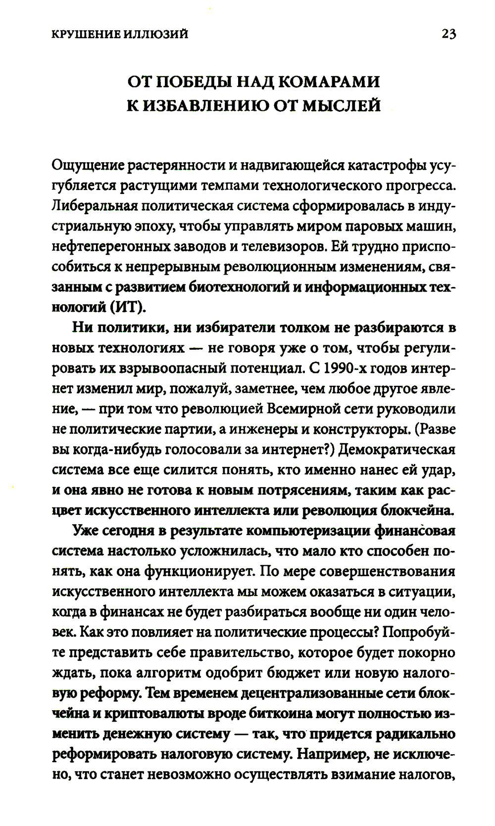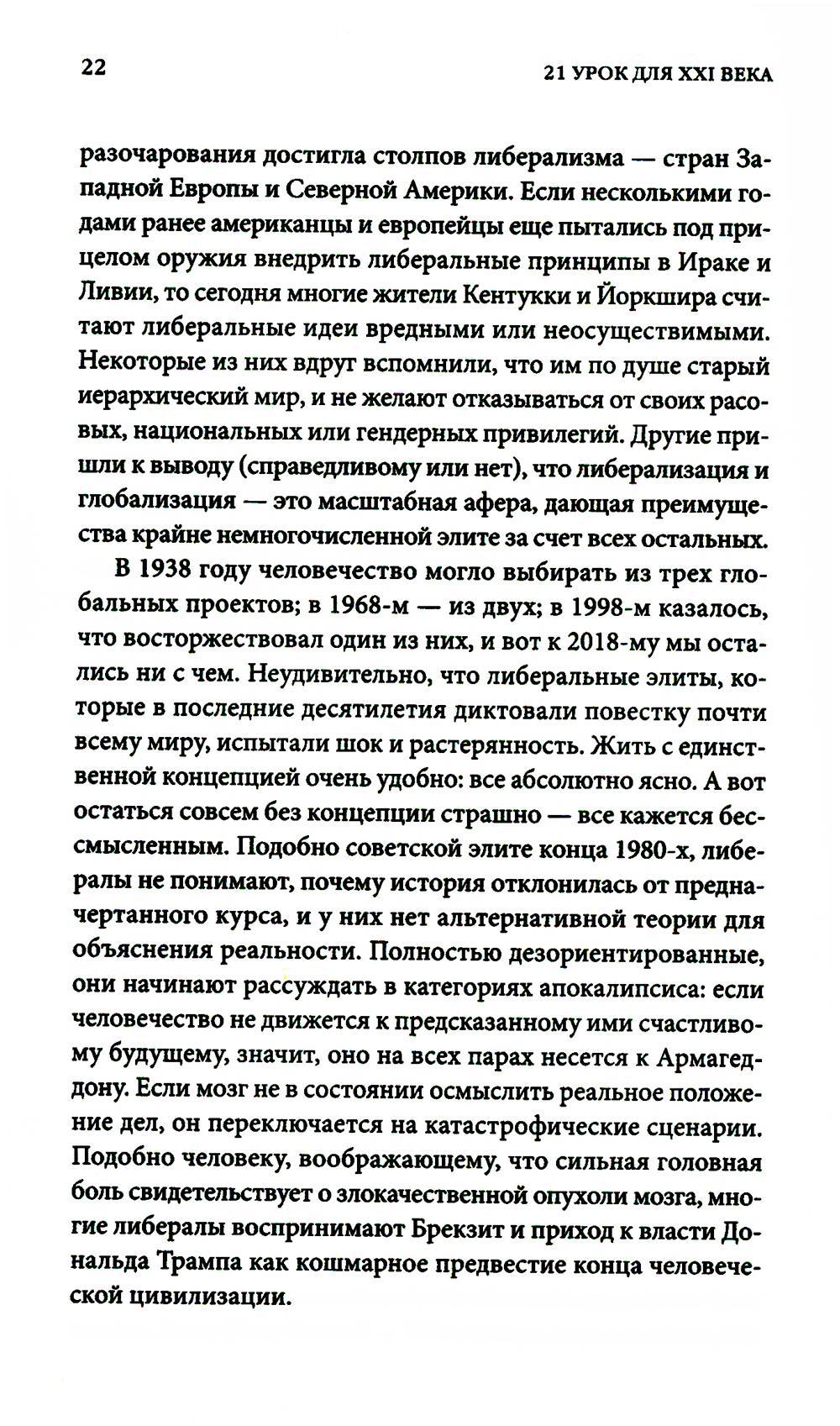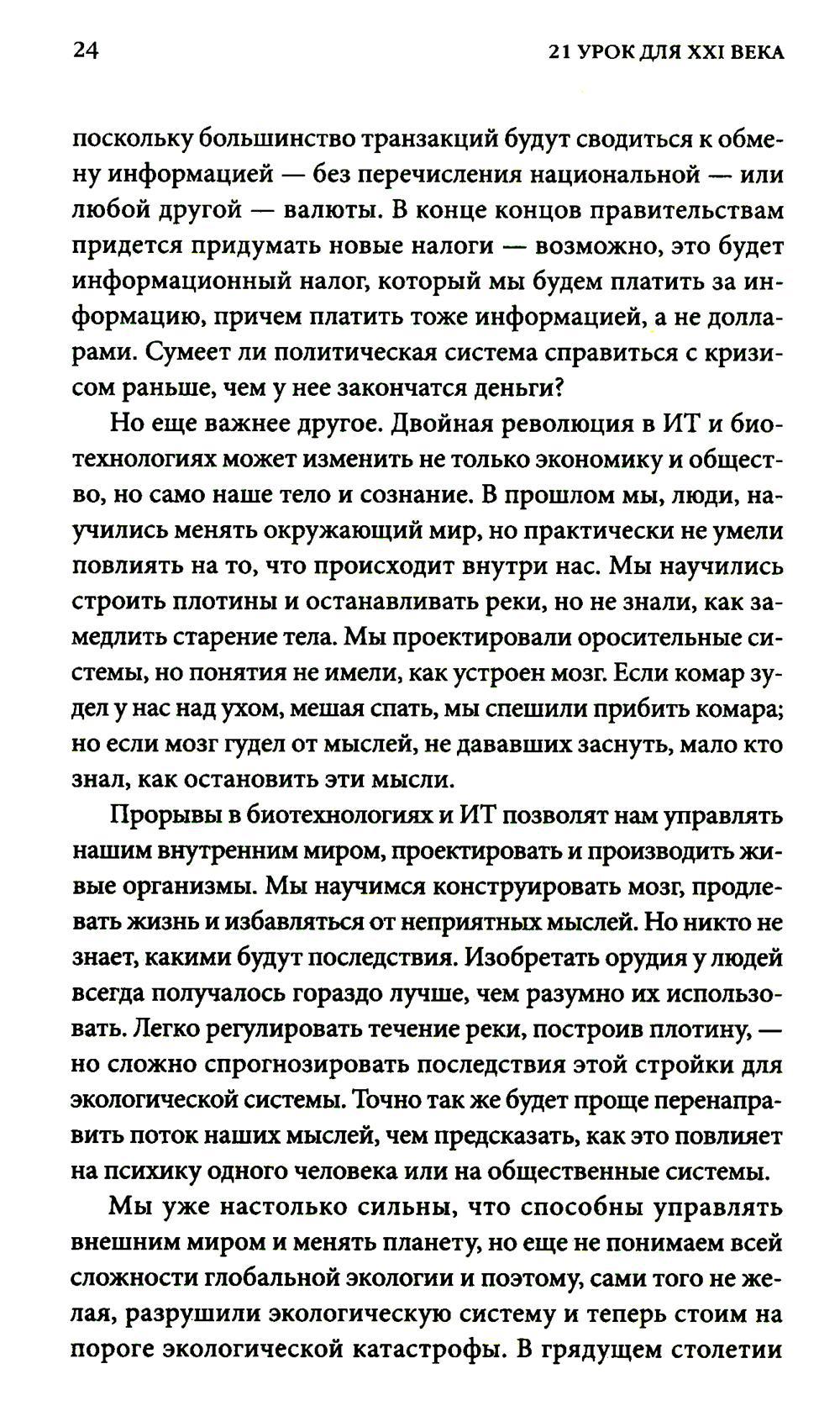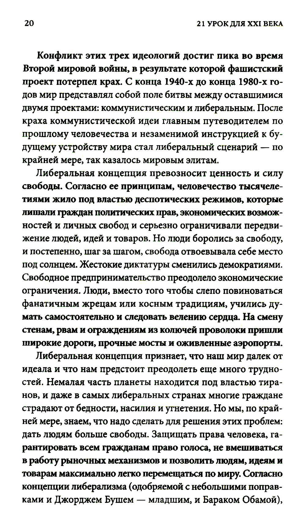 «21 урок для XXI века» - третья книга Юваля Харари, автора изданных на 50 языках мира бестселлеров «Sapiens. Краткая история человечества» и «Homo Deus. Краткая история будущего». В ней сорокатрехлетний профессор истории, которого называют самым ярким мыслителем нашего времени, обратился к проблемам сегодняшнего дня. Что происходит в современном мире и каков глубинный смысл этих событий? Почему либеральная демократия переживает кризис? Как быть с эпидемией фейковых новостей? Как не стать рабами компьютерных алгоритмов? Удастся ли предотвратить экологический коллапс? Действительно ли происходит возврат к религии? Как бороться с терроризмом? Будет ли новая мировая война? От того, сумеет ли человечество найти адекватные ответы на вызовы, стоящие перед ним в XXI веке, зависит, будет ли существовать планета Земля и ее обитатели в следующем столетии.| Издательство | Синдбад |