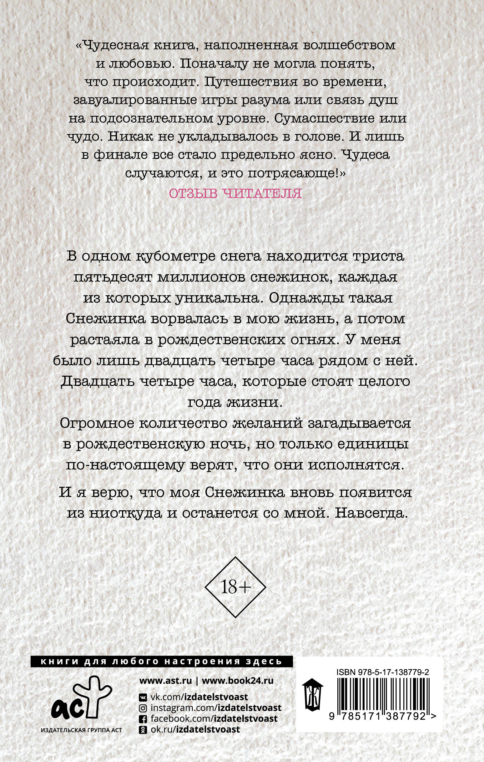 В одном кубометре снега находится триста пятьдесят миллионов снежинок, каждая из которых уникальна. Однажды такая Снежинка ворвалась в мою жизнь, а потом растаяла в рождественских огнях. У меня было лишь двадцать четыре часа рядом с ней. Двадцать четыре часа, которые стоят целого года жизни. Огромное количество желаний загадывается в рождественскую ночь, но только единицы по-настоящему верят, что они исполнятся. И я верю, что моя Снежинка вновь появится из ниоткуда и останется со мной. Навсегда.| Издательство | Издательство "АСТ" |