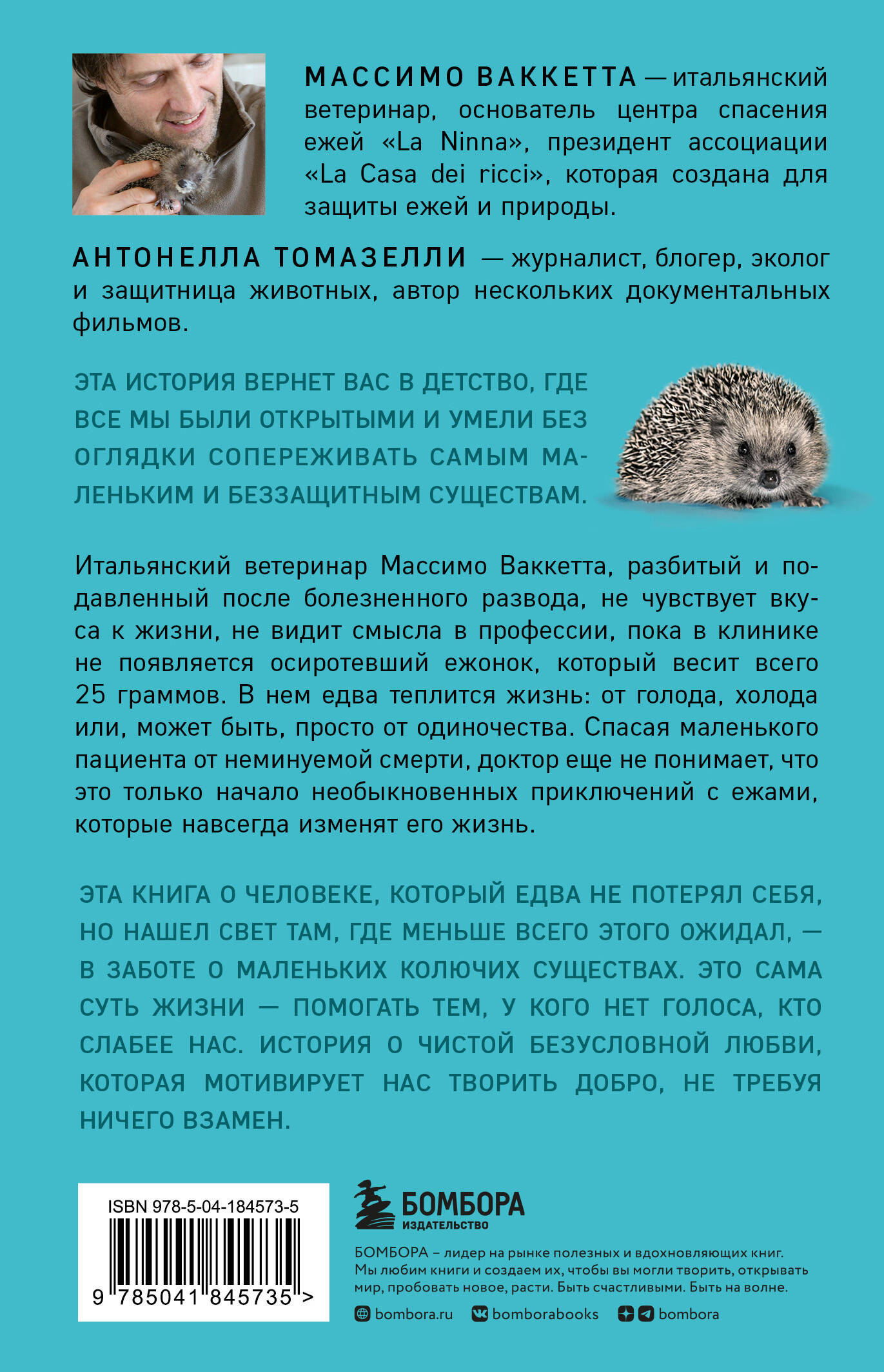 Ни одна любовь не может быть слишком большой, и ни одно существо не может быть слишком маленьким для этой любви! Представьте, что вы случайно находите маленького розового ежонка с короной из белых и мягких шипов на спине. Он весит всего 25 граммов, и в нем едва теплится жизнь: от голода, холода или, может быть, просто от одиночества. Сможете ли вы пройти мимо?.. Массимо Ваккетта - итальянский ветеринарный врач, который всю жизнь лечил крупный рогатый скот, - недавно развелся и чувствовал себя разбитым и подавленным - ровно до того дня, когда кто-то принес в клинику осиротевшего маленького ежика. Крошечный ежик, весом всего в 25 граммов, был так же уязвим и одинок, как Массимо. И эта беспомощность дикого существа разбила вдребезги броню на сердце человека. Он привязался к ежонку так, как никогда не был связан ни с каким другим животным. Борьба за жизнь колючего крохи помогла ветеринару выйти из депрессии и обрести новый смысл в своей профессии. Спасая ежика Нинну, Массимо избавляется от апатии и пустоты в душе, и вскоре в его руках один за другим оказываются другие ежи: люди со всей округи начинают искать необычного ветеринара, чтобы исцелить и позаботиться о самых уязвимых и слабых существах, которых порой никто не замечает. Однажды автора спросили: «Но почему вы это делаете? Зачем вы спасаете ежей?» И он ответил: «Они делают меня счастливым». Для тех, кто хочет прочесть добрую и трогательную книгу, которая заставит улыбнуться, - это настоящая находка. Истории, в которых Массимо рассказывает о своей маленькой ежихе Нинне, возвращают в детство, где все мы были открытыми и умели без оглядки сопереживать самым маленьким и беззащитным существам. Это история о человеке, который едва не потерял себя, и ему удалось найти свет там, где он меньше всего этого ожидал, - в заботе о маленьких ежах. Это сама суть жизни - помогать тем, у кого нет голоса, кто слабее нас, - история о чистой безусловной любви, которая делает добро, не ожидая ничего взамен. Массимо Ваккетта - итальянский ветеринар, основатель центра спасения ежей «La Ninna», президент ассоциации «La Casa dei ricci», которая призвана защитить ежей и природу.| Издательство | ООО "Издательство "Эксмо" |