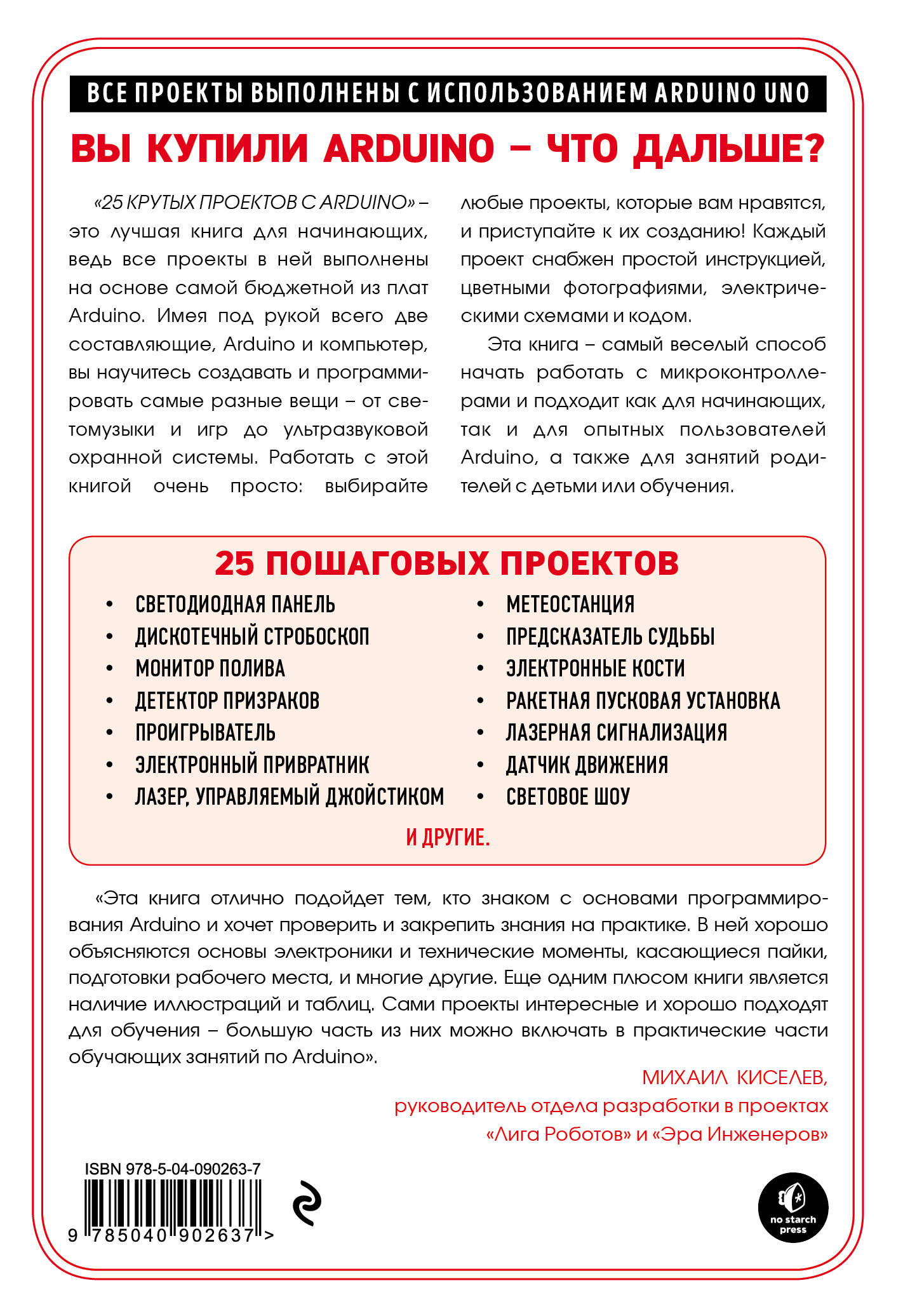 Стробоскоп для дискотеки, лазер, ракетная пусковая установка, детектор привидений и множество других классных вещей можно собрать собственными руками, благодаря этой красочной книге с пошаговыми инструкциями! Изучай Arduino, создавая 25 несложных, но веселых, интересных и полезных проектов, которые можно подарить друзьям или использовать самому. Этот самоучитель подходит для детей и взрослых - для начинающих и для тех, кто уже имел дело с конструктором Arduino раньше.| Издательство | ООО "Издательство "Эксмо" |