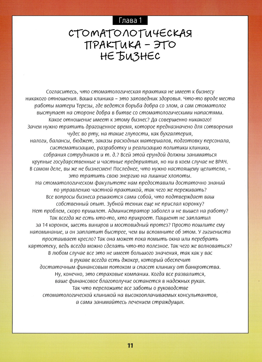 За годы консультирования стоматологов по управлению клиникой автор сформулировал 25 способов гарантированно разрушить стоматологическую практику. Его открытия основаны на реальном опыте и фактическом положении дел. Автор понял, насколько легко упустить из виду все те изощренные методы, которые мы ежедневно используем подсознательно и несознательно для негативного влияния на атмосферу в личной и профессиональной жизни. Так же легко мы сознательно допускаем такие милые вредные, деструктивные действия, на которые даже не обращаем внимания, недооценивая их эффективность в деле разрушения практики.| Издательство | Азбука стоматолога |