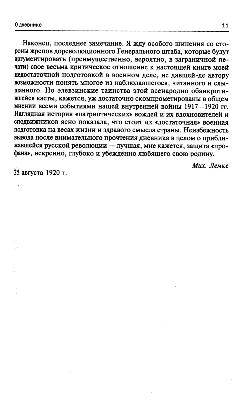 Михаил Лемке (1872-1923) писатель, публицист, автор трудов по истории журналистики и цензуры, известен прежде всего подробнейшими воспоминаниями о службе в Ставке Верховного главнокомандующего в годы Первой мировой войны. С сентября 1915 года М. К. Лемке занимал должность военного цензора, а также отвечал за взаимодействие армейского начальства с прессой. Имея доступ к деловой переписке, приказам и донесениям, в том числе к особо секретным, штабс-капитан Лемке копировал все проходившие через него документы в дневник, в котором также записывал беседы с сослуживцами всех чинов и званий от простых солдат до командующих фронтами. Из этих записок можно узнать о положении дел в армии незадолго до падения Российской империи: о проблемах со снабжением, недостаточном техническом и инженерном оснащении частей, пагубной практике протекционизма, интригах и даже адюльтерах. Книга наполнена мрачными предчувствиями надвигающихся перемен и робкой надеждой на грядущее обновление жизни.| Издательство | Центрполиграф |