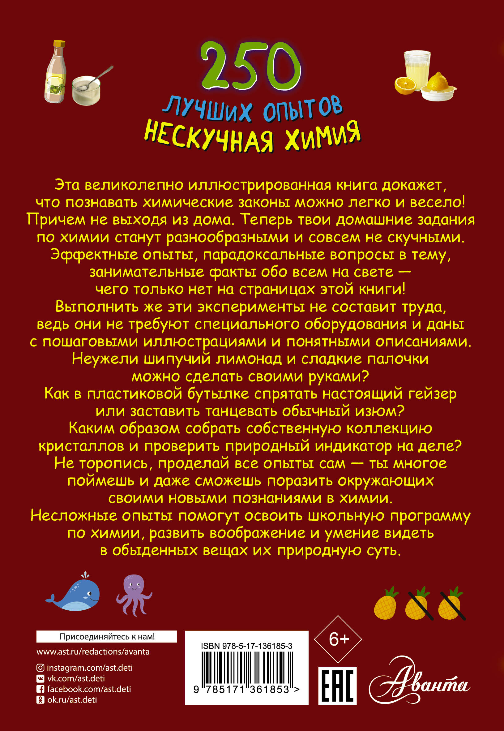 Не знаешь, как усвоить такой сложный предмет, как химия? Лучшие эксперименты, касающиеся этой науки, в твоем распоряжении! Данное издание содержит пошаговые иллюстрации и описания интереснейших опытов, которые могут проделать даже самые юные читатели. Они станут прекрасным поводом для знакомства с основными химическими законами. Множество доказательных, обучающих и при этом веселы экспериментов можно проделать на улице, на кухне и даже за письменным столом. Простым языком наглядного примера здесь поясняются различные явления окружающего нас мира. А результаты опытов и объяснения к ним изложены так доступно, что все сложное непременно станет простым. Эта великолепно иллюстрированная книга докажет, что заниматься химией можно легко и весело! Для среднего школьного возраста.| Издательство | Издательство "АСТ" |