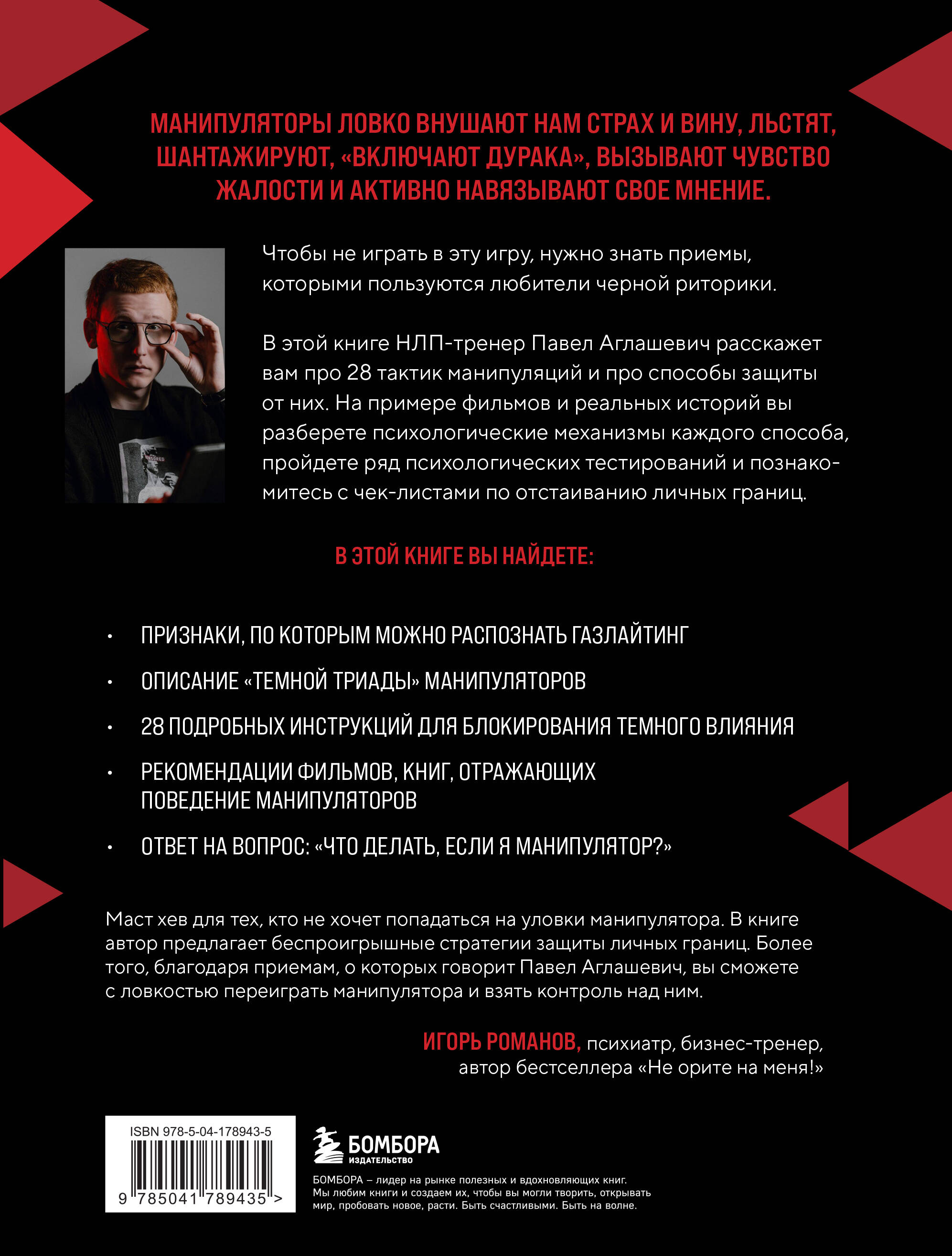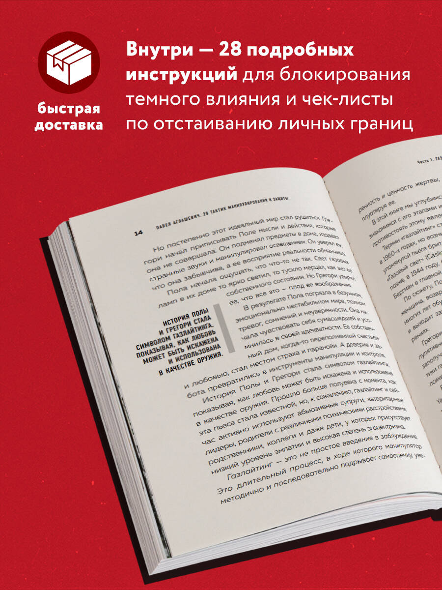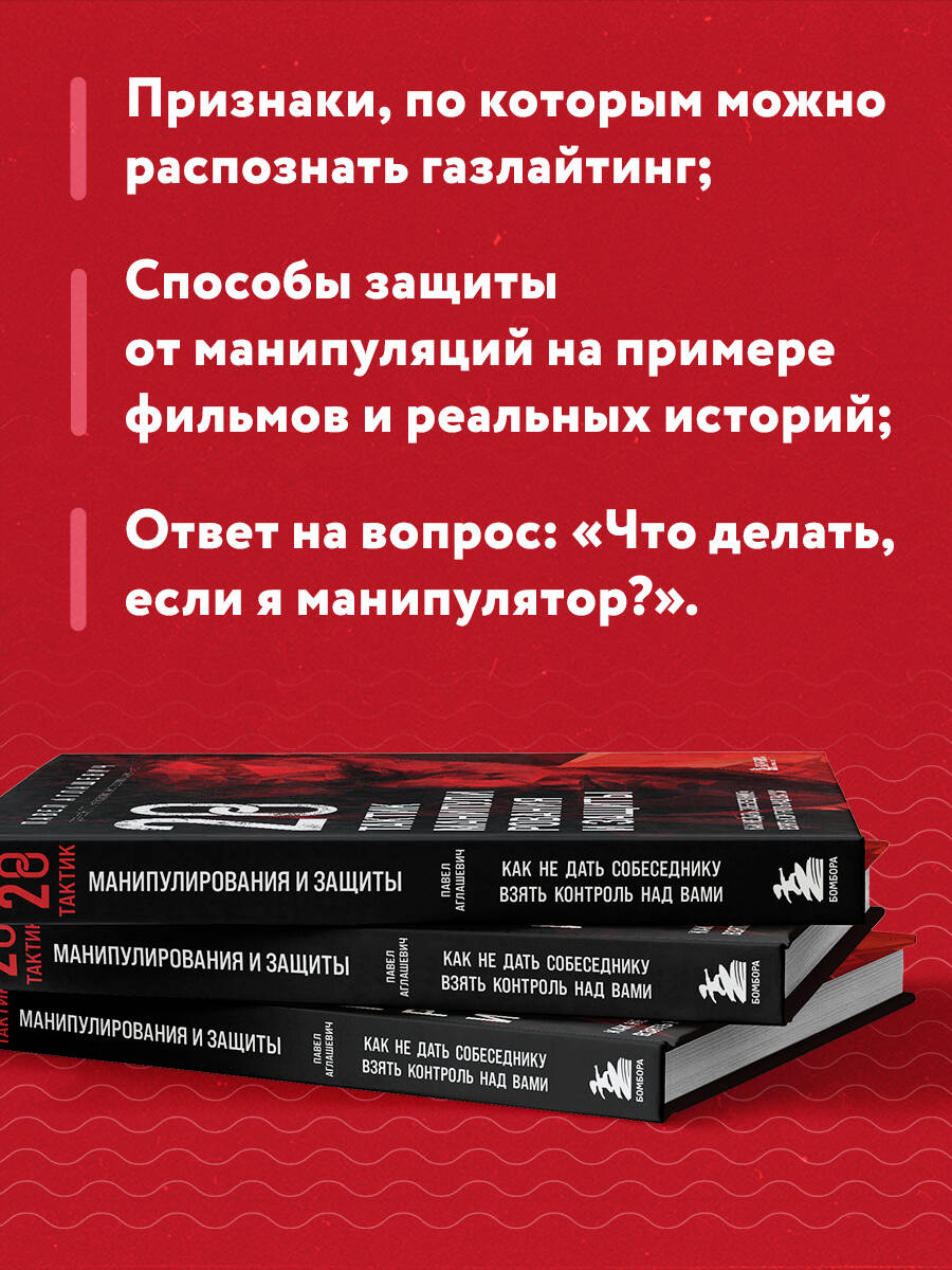 Манипуляторы ловко внушают нам страх и вину, льстят, шантажируют, «включают дурака», вызывают чувство жалости и активно навязывают свое мнение. Чтобы не играть в эту игру, нужно знать приемы, которыми пользуются любители черной риторики. В этой книге НЛП-тренер Павел Аглашевич расскажет вам про 28 тактик манипуляций и способы защиты от них. На примере фильмов и реальных историй вы разберете психологические механизмы каждого способа, пройдете ряд психологических тестирований и познакомитесь с чек-листами по отстаиванию личных границ. В этой книге вы найдете: - Признаки, по которым можно распознать газлайтинг. - Описание «темной триады» манипуляторов. - 28 подробных инструкций для блокирования темного влияния. - Рекомендации фильмов, книг, отражающих поведение манипуляторов. - Ответ на вопрос: «Что делать, если я манипулятор?».