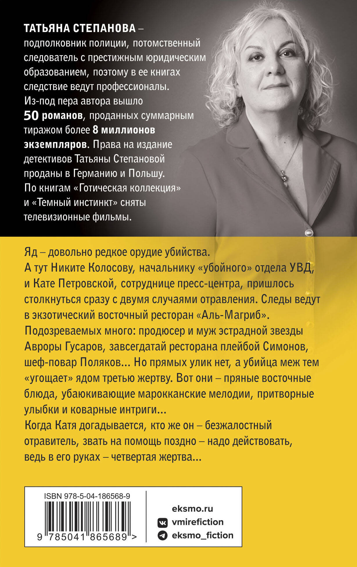 Яд - довольно редкое орудие убийства. А тут Никите Колосову, начальнику «убойного» отдела УВД, и Кате Петровской, сотруднице Пресс-центра, пришлось столкнуться сразу с двумя случаями отравления. Следы ведут в экзотический восточный ресторан «Аль-Магриб». Подозреваемых много: продюсер и муж эстрадной звезды Авроры Гусаров, завсегдатай ресторана плейбой Симонов, шеф-повар Поляков... Но прямых улик нет, а убийца меж тем «угощает» ядом третью жертву. Вот они - пряные восточные блюда, убаюкивающие марокканские мелодии, притворные улыбки и коварные интриги... Когда Катя догадывается, кто же он - безжалостный отравитель, звать на помощь поздно - надо действовать, ведь в его руках - четвертая жертва... Романы потомственного следователя Татьяны Степановой позволяют читателю побывать в литературной «комнате страха». Таинственные убийства, почти осязаемая атмосфера преступления, томительное и тревожное ожидание чего-то неведомого, пугающего... Все это Татьяне Степановой удается воспроизвести просто блестяще. Случайные встречи, повседневные дела, незначительные детали изображаются в ее детективах в каком-то особом, драматическом свете, словно безобидный весенний луг перед стремительно надвигающейся грозой.| Издательство | ООО "Издательство "Эксмо" |