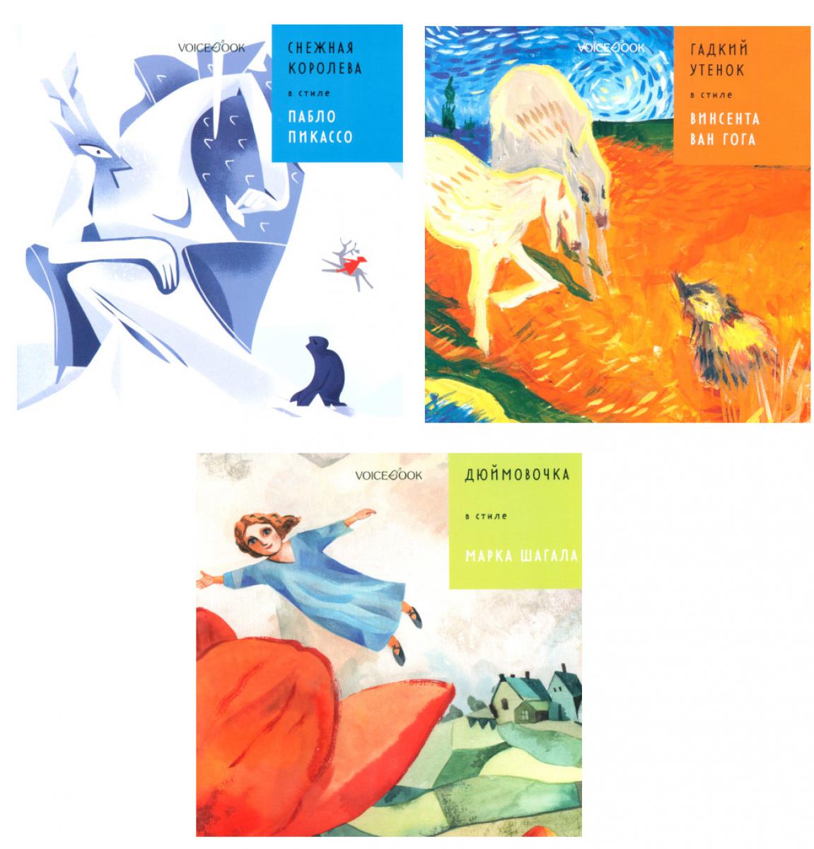 Комплект из 3 книг: «Снежная Королева в стиле Пабло Пикассо» Переложение всем известной зимней сказки о Снежной королеве в новом издании - это история о любви и надежде, рассказанная при помощи ярких и живых мазков и фигур в стиле позднего Пикассо. Угловатые и страстные картины Пикассо в манере кубизма стали источником вдохновения для иллюстратора, создавшего свои рисунки к сказке «Снежная королева», чтобы передать художественным языком и геометрическими форматами рассказ о девочке Герде и мальчике Кае. «Гадкий Утенок в стиле Винсента Ван Гога» Грустная добрая сказка со счастливым концом о бедном утенке сопровождается красочными рисунками в манере великого голландского художника Винсента Ван Гога. Экспрессивные и отчаянные, яркие и трогательные работы мастера послужили источником вдохновения для иллюстратора, создавшего свои рисунки к сказке «Гадкий утенок». Необычные иллюстрации позволяют познакомить ребенка с разными стилями в живописи. «Дюймовочка в стиле Марка Шагала» Нежная и аллегорическая история о девочке размером с наперсток (Дюймовочка) сопровождается фантасмагорическими и воздушными рисунками в манере Марка Шагала. Наивное и окрыленное творчество великого белорусского художника стало источником вдохновения для иллюстратора, чтобы рассказать историю странствий крошечной Дюймовочки, поведать о ее добром сердце и о маленьком сказочном мире. Листая страницы книги, ребенок может познакомиться с направлением авангардистской живописи и открыть для себя Марка Шагала.| Издательство | VoiceBook |