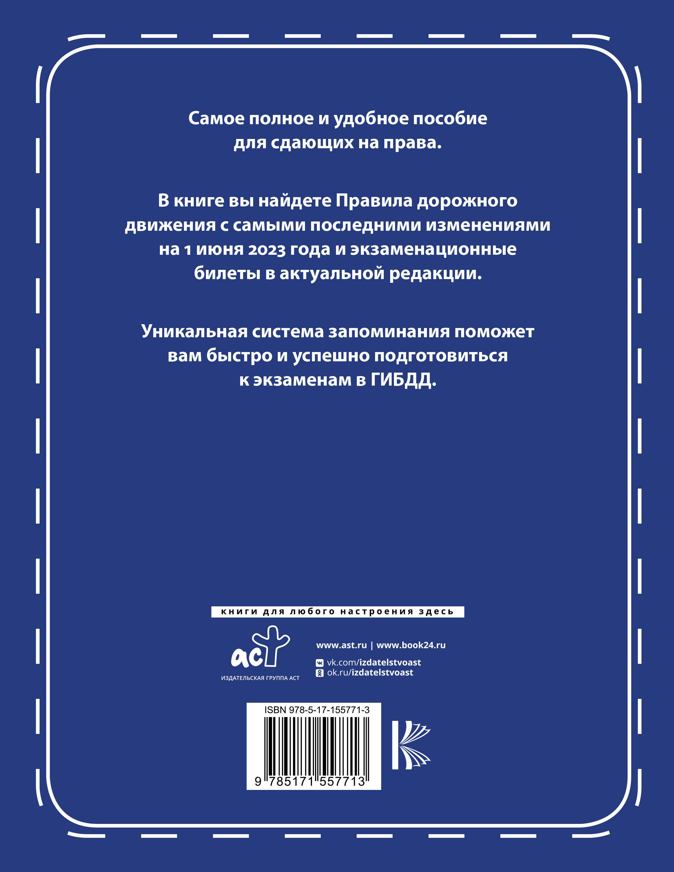 Это самое полное и удобное пособие для сдающих на права. В книге Вы найдете: - Уникальную систему запоминания, которая поможет Вам быстро и успешно подготовиться к экзаменам в ГИБДД; - Правила дорожного движения с самыми последними изменениями на 1 июня 2023 года; - Экзаменационные билеты в актуальной редакции; - Таблицу штрафов и других санкций за нарушение ПДД; - Правила оказания первой помощи пострадавшим на дороге. Издание учитывает все изменения, опубликованные в официальных источниках на момент подписания издания в печать.