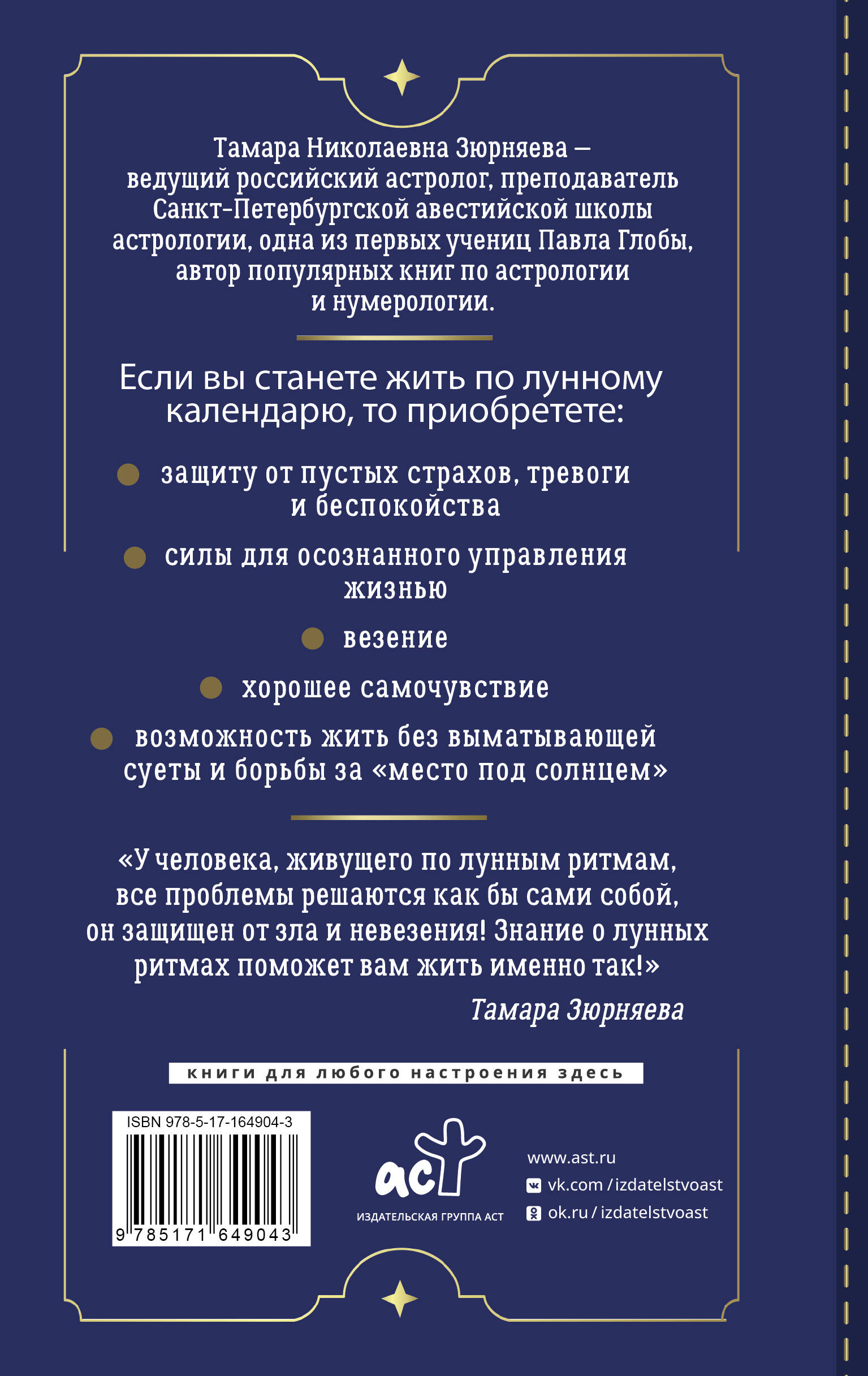 На протяжении всей жизни человек подвергается влиянию космических ритмов. Во все времена многие успешные люди планировали свою жизнь по лунному календарю. С Луной связаны скрытые тайные силы, которые влияют на подсознание человека. Поэтому учет положения Луны помогает распутать узлы проблем, а также избегать многих ошибок. Автор книги Тамара Зюрняева - ведущий российский астролог, преподаватель Санкт-Петербургской авестийской школы астрологии, предлагает разобраться в лунном календаре и лунных днях. В книге вы найдете информацию о каждом лунном дне до 2050 года! Вычислите, в какие дни Луна покровительствует вашим начинаниям, какие обстоятельства в определенный день могут помешать вашим делам. С помощью книги вы сможете составлять собственные прогнозы. Если вы станете жить по лунному календарю, то приобретете: • защиту от пустых страхов, тревоги и беспокойства; • силы для осознанного управления жизнью; • везение; • хорошее самочувствие; • возможность жить без выматывающей суеты и борьбы за "место под солнцем". Книга станет вашим путеводителем в мир достатка и успеха. Поможет осуществить желаемое, наладить личную жизнь, добиться поставленных целей и стать преуспевающим человеком.| Издательство | Издательство "АСТ" |