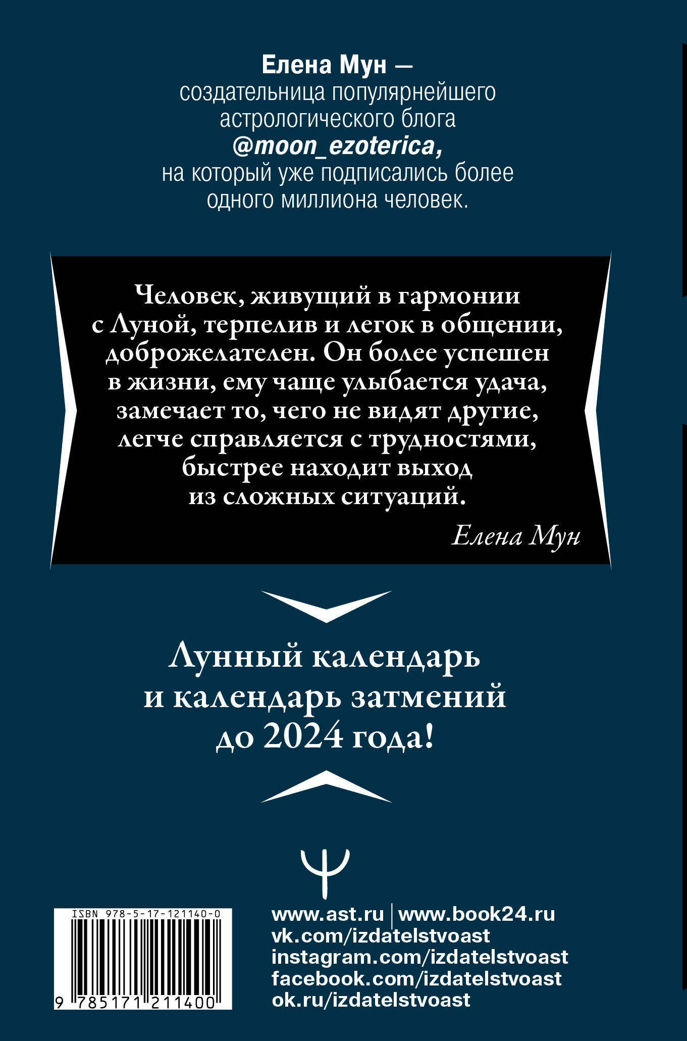 Лунный календарь много тысячелетий помогает планировать жизнь успешным политикам, полководцам и миллионерам. Каждый день в календаре имеет свою особенность и смысл. Если выбрать благоприятный день для встречи, магического ритуала или важного мероприятия, то обстоятельства будут удивительным образом складываться с вашу пользу. Елена Мун - создательница астрологического блога @moon_ezoterica, на который уже подписались более одного миллиона человек, - на собственном опыте убедилась, какую огромную роль в нашей жизни играют Луна и лунный календарь. Лунные ритуалы и знания особенностей лунных дней помогли ей выйти из кризисной ситуации, когда в жизни были только миллионные долги, а сама жизнь была похожа на день сурка. Книга поможет вам разобраться в лунном календаре, найти благоприятные дни для важных дел и привлечь удачу, любовь и деньги при помощи очень действенных лунных ритуалов. В конце книги вы найдете лунный календарь и календарь затмений, которые помогут вам планировать вашу новую счастливую жизнь.| Издательство | Издательство "АСТ" |