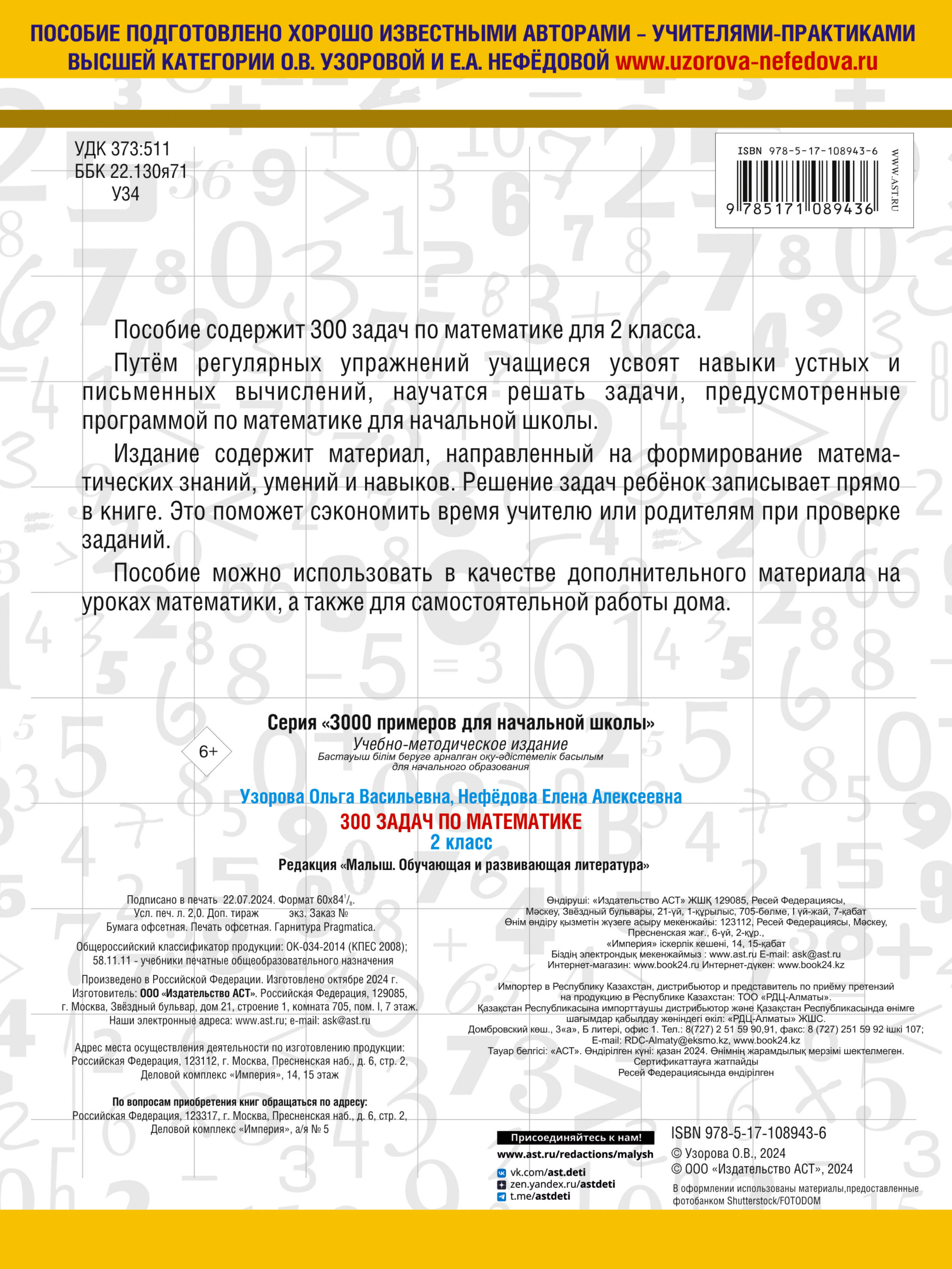 Пособие содержит 300 задач по математике для 2 класса. Путем регулярных упражнений учащиеся усвоят навыки устных и письменных вычислений, научатся решать задачи, предусмотренные программой по математике для начальной школы. Издание содержит материал, направленный на формирование математических знаний, умений и навыков. Для удобства использования решение задач ребенок записывает прямо в книге. Это поможет сэкономить время учителю или родителям при проверке заданий. Пособие можно использовать в качестве дополнительного материала на уроках математики, а также для самостоятельной работы дома-.| Издательство | ИЗДАТЕЛЬСТВО "АСТ" |