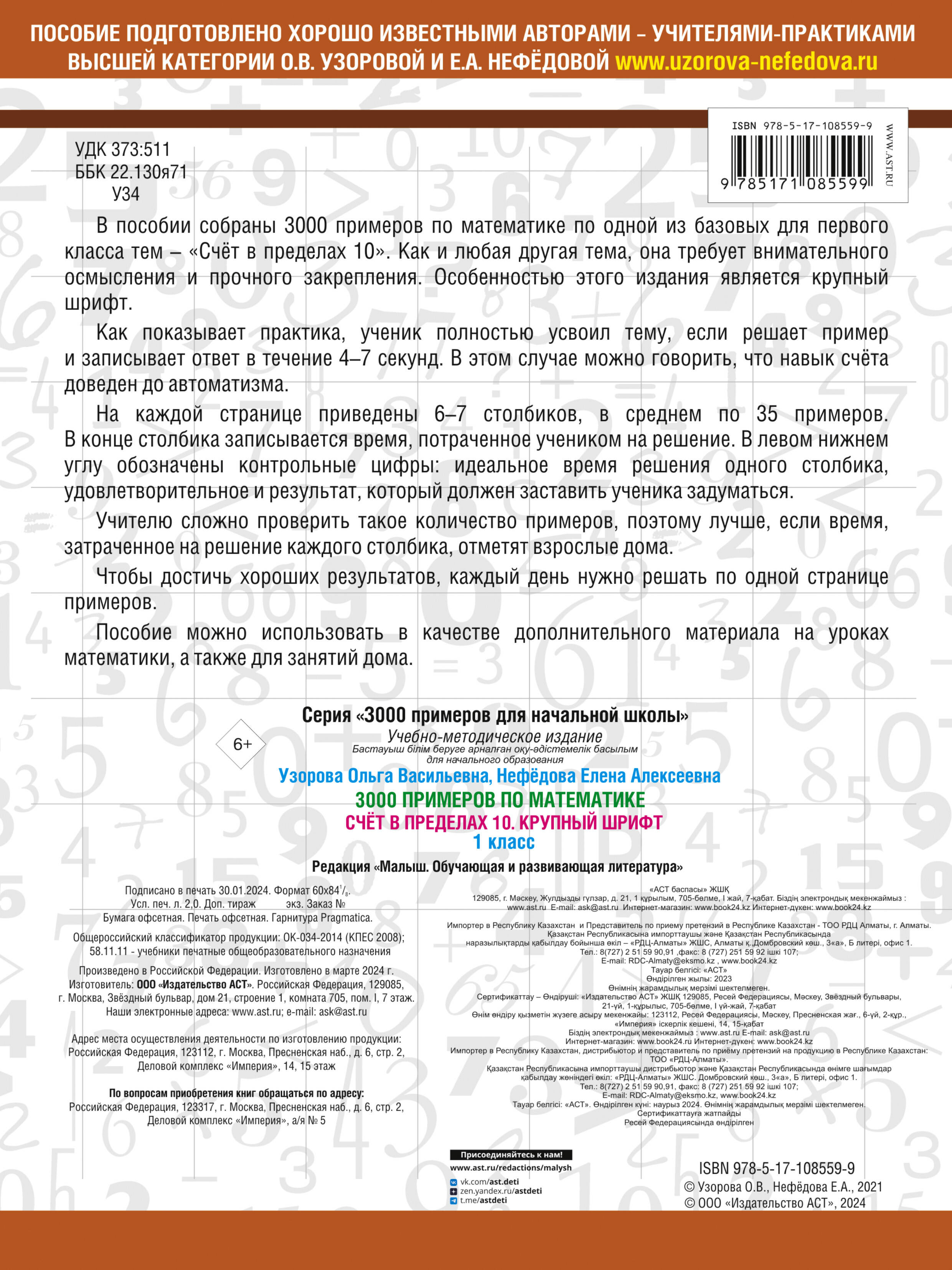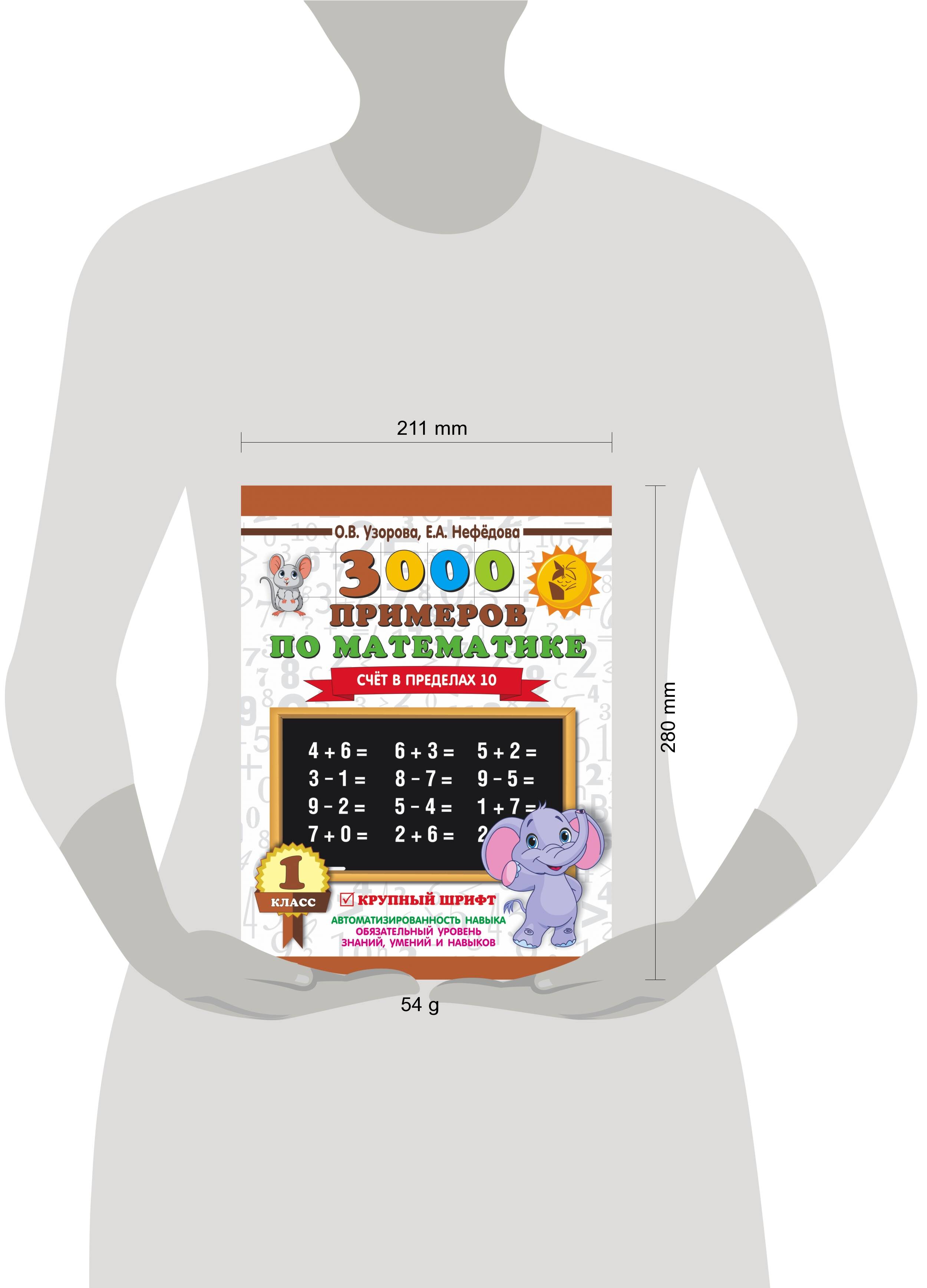 В пособии собраны 3000 новых примеров по математике по одной из базовых для первого класса тем - «Счёт в пределах 10». Как и любая другая тема, она требует внимательного осмысления и прочного закрепления. Особенностью этого издания является крупный шрифт. Как показывает практика, ученик полностью усвоил тему, если решает пример и записывает ответ в течение 4 - 7 секунд. В этом случае можно говорить, что навык счета доведен до автоматизма. На каждой странице приведены 6 - 7 столбиков, в среднем по 35 примеров. В конце столбика записывается время, потраченное учеником на решение. В левом нижнем углу обозначены контрольные цифры: идеальное время решения одного столбика, удовлетворительное и результат, который должен заставить ученика задуматься. Учителю сложно проверить такое количество примеров, поэтому лучше, если время, затраченное на решение каждого столбика, отметят взрослые дома. Чтобы достичь хороших результатов, каждый день нужно решать по одной странице. Пособие можно использовать в качестве дополнительного материала на уроках математики, а также для занятий дома.| Издательство | ИЗДАТЕЛЬСТВО "АСТ" |