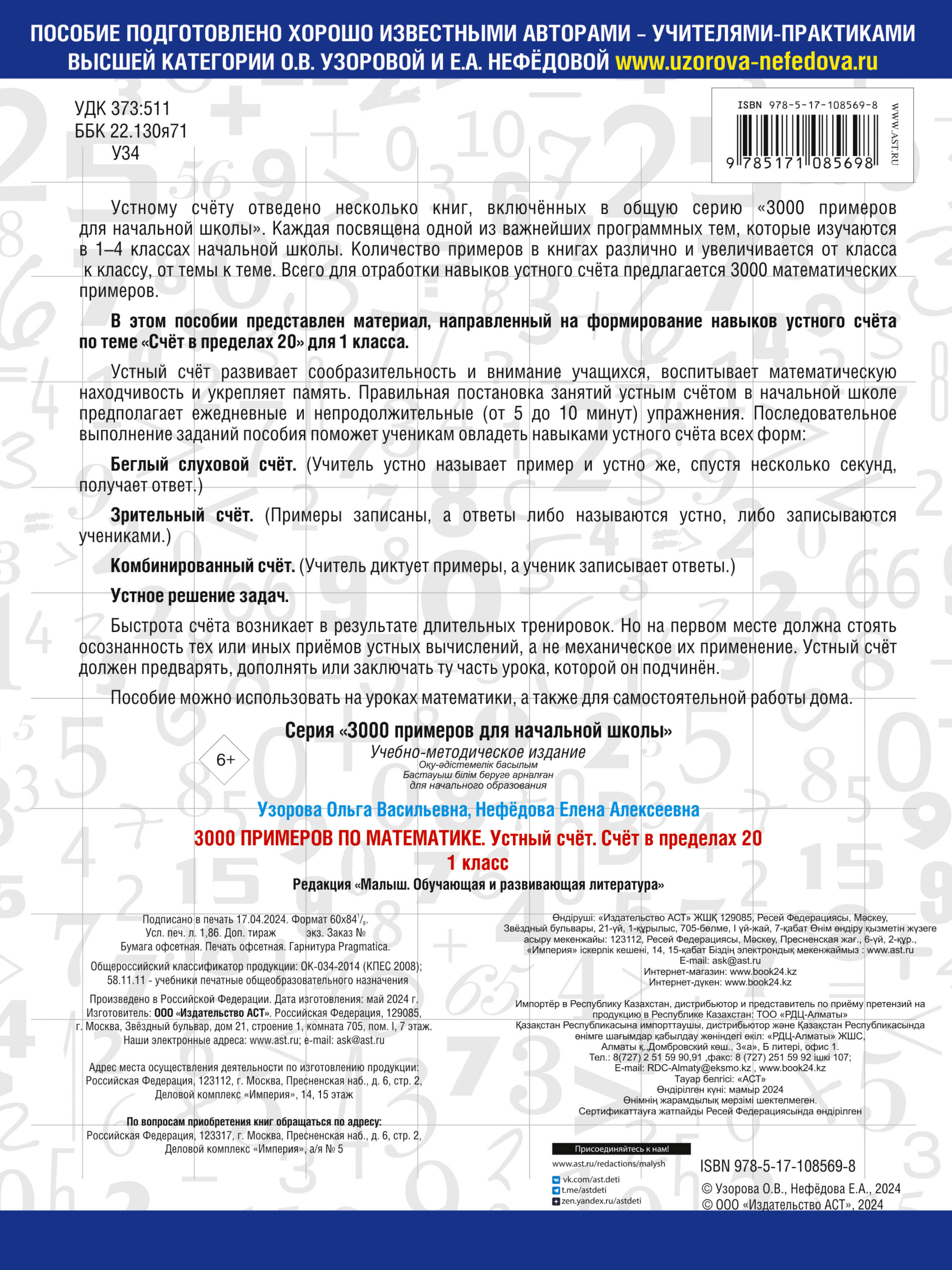 В книге известных педагогов-практиков, авторов самых издаваемых учебников и учебных пособий в России О.В. Узоровой и Е.А. Нефёдовой представлен материал, направленный на формирование навыков устного счета по теме «Счет в пределах 20» для 1 класса. Последовательное выполнение заданий пособия поможет ученикам овладеть навыками устного счета всех форм, разовьет у них сообразительность, внимание и математическую находчивость. Пособие можно использовать на уроках в школе, а также для самостоятельных занятий дома.| Издательство | ИЗДАТЕЛЬСТВО "АСТ" |