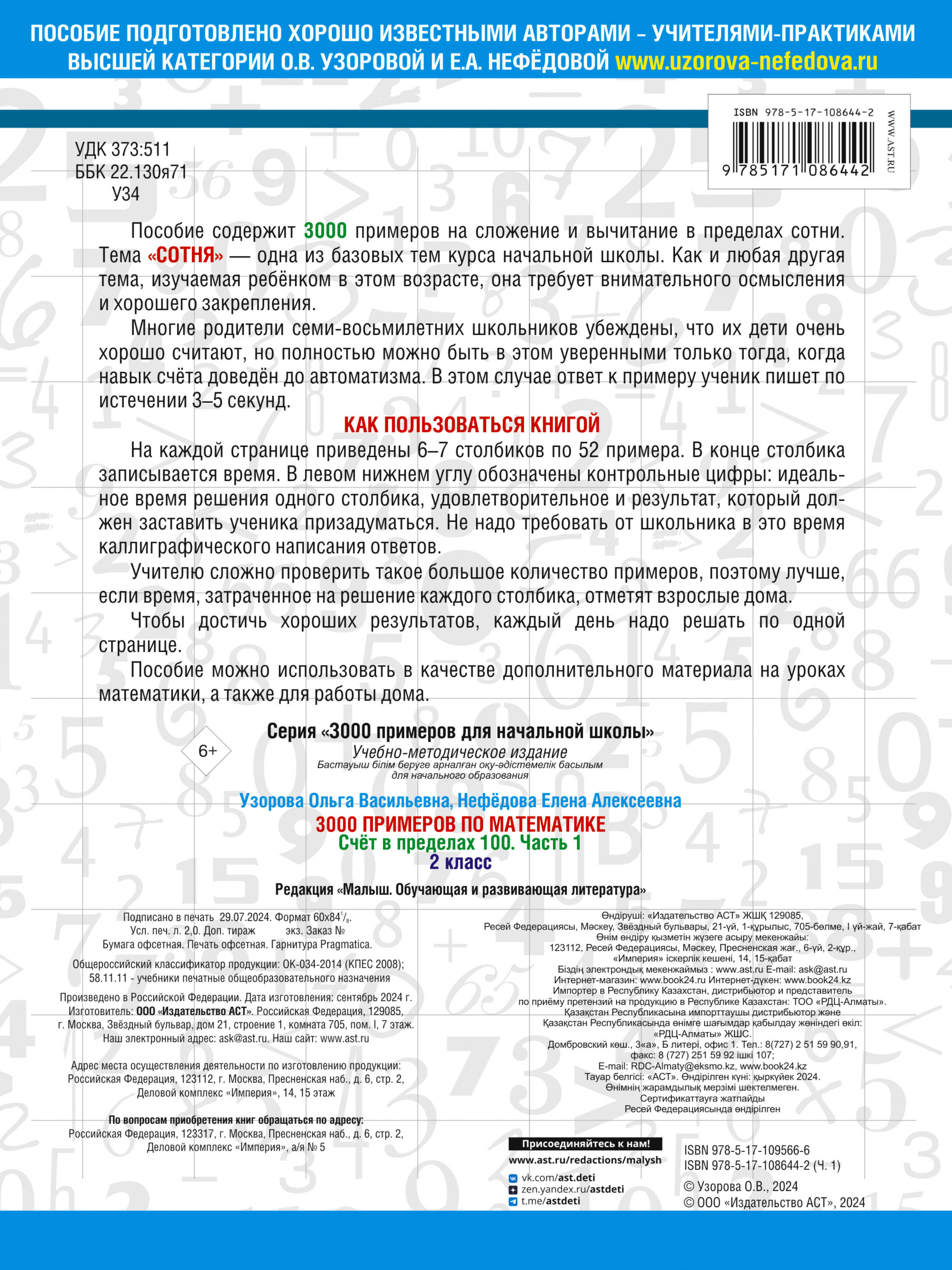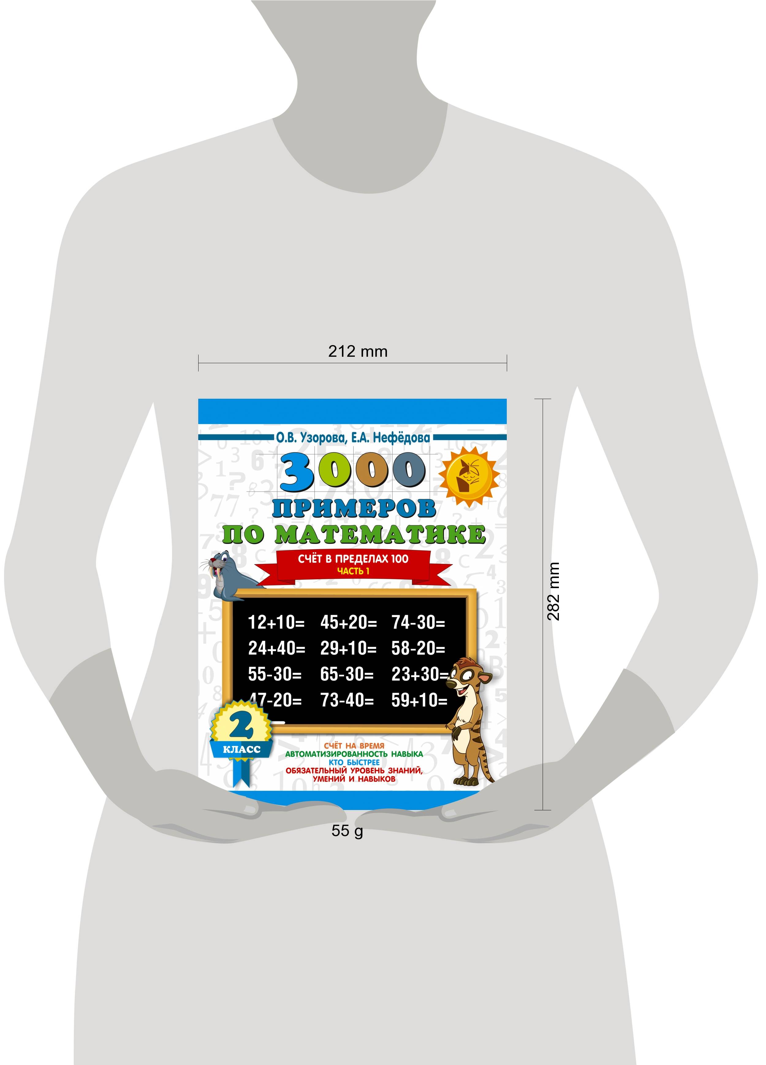 Данное пособие содержит 3000 примеров на сложение и вычитание в пределах сотни. Тема "СОТНЯ" - одна из базовых тем курса начальной школы. Как и любая другая тема, изучаемая ребёнком в этом возрасте, она требует внимательного осмысления и хорошего закрепления. Многие родители семи-восьмилетних школьников убеждены, что их дети очень хорошо считают, но полностью можно быть в этом уверенными только тогда, когда навык счёта доведён до автоматизма. В этом случае ответ к примеру ученик пишет по истечении 3-5 секунд. КАК ПОЛЬЗОВАТЬСЯ КНИГОЙ На каждой странице приведены 6-7 столбиков по 52 примера. В конце столбика записывается время. В левом нижнем углу обозначены контрольные цифры: идеальное время решения одного столбика, удовлетворительное и результат, который должен заставить ученика призадуматься. Не надо требовать от школьника в это время каллиграфического написания ответов. Учителю сложно проверить такое большое количество примеров, поэтому лучше, если время затраченное на решение каждого столбика, отметят взрослые дома. Чтобы достичь хороших результатов, каждый день надо решать по одной странице. Послбие можно использовать в качестве дополнительного материала на уроках математики, а также для работы дома.| Издательство | ИЗДАТЕЛЬСТВО "АСТ" |