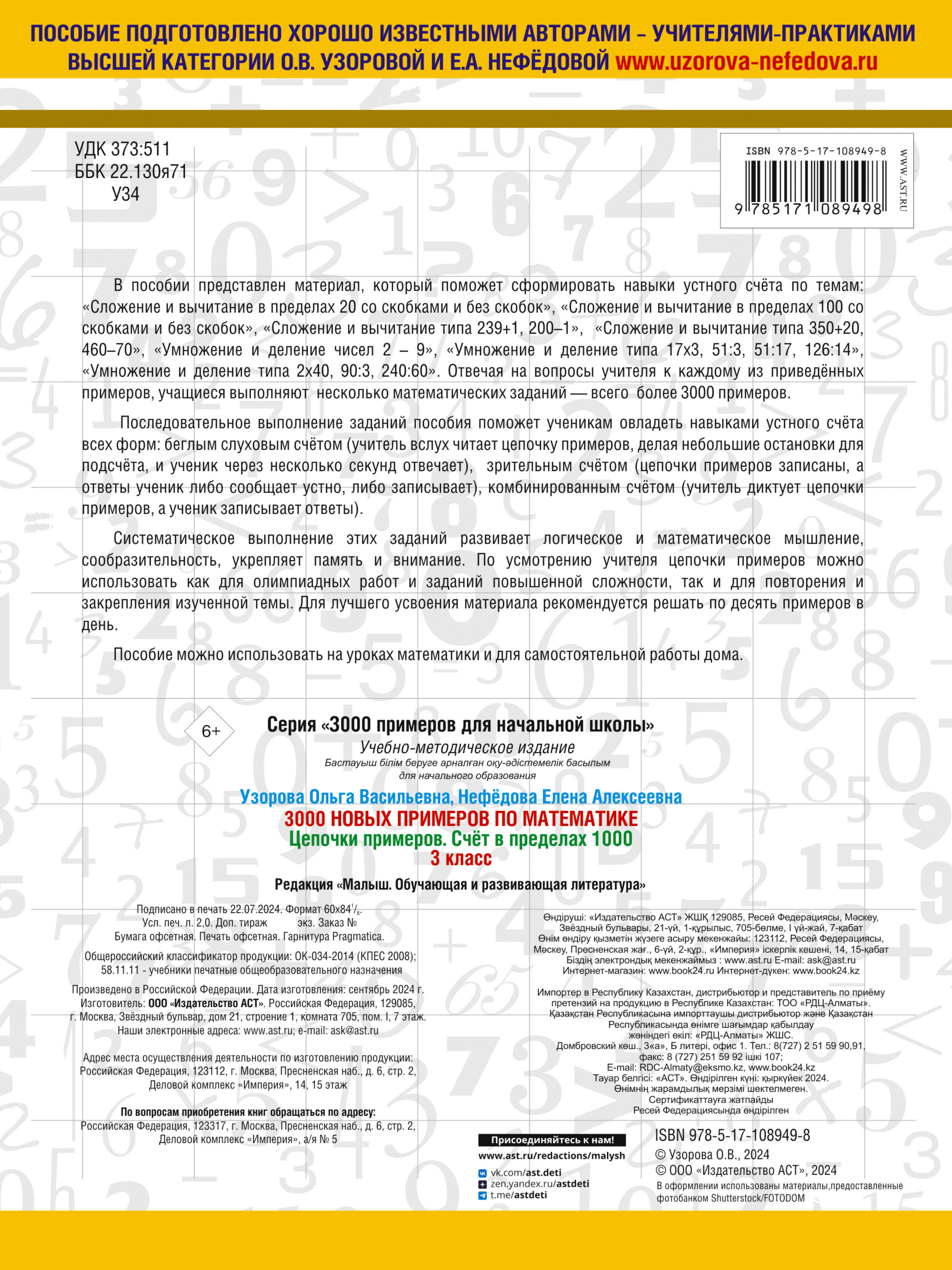 Аннотация: 3000 примеров по математике. 3 класс. Цепочки примеров. Счёт в пределах 1000