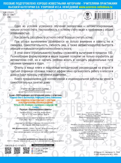 Одно из условий успешного обучения математике - автоматизированные навыки устного счёта. Неспособность к устному счёту ведёт к проблемам с общей успеваемостью. Как развить способности устного счёта? Больше считать устно. При устных вычислениях развиваются не только внимание и память, но и смекалка, самостоятельность, гибкость ума, а также автоматизируется быстрота реакции и повышается работоспособность мозга. В этой книге отрабатываются приёмы сложения и вычитания в пределах 100. Разнообразие формулировок и видов заданий позволит не только отработать до автоматизма счёт, но и научить ребёнка искать и находить рациональные пути решения примеров и задач. Ответы в конце книги и подробные методические рекомендации на второй и третьей сторонках обложки помогут эффективно организовать работу в классе и дома и будут полезны учителям и родителям. Книга предназначена для коллективной и индивидуальной работы на уроке и самостоятельных занятий дома.