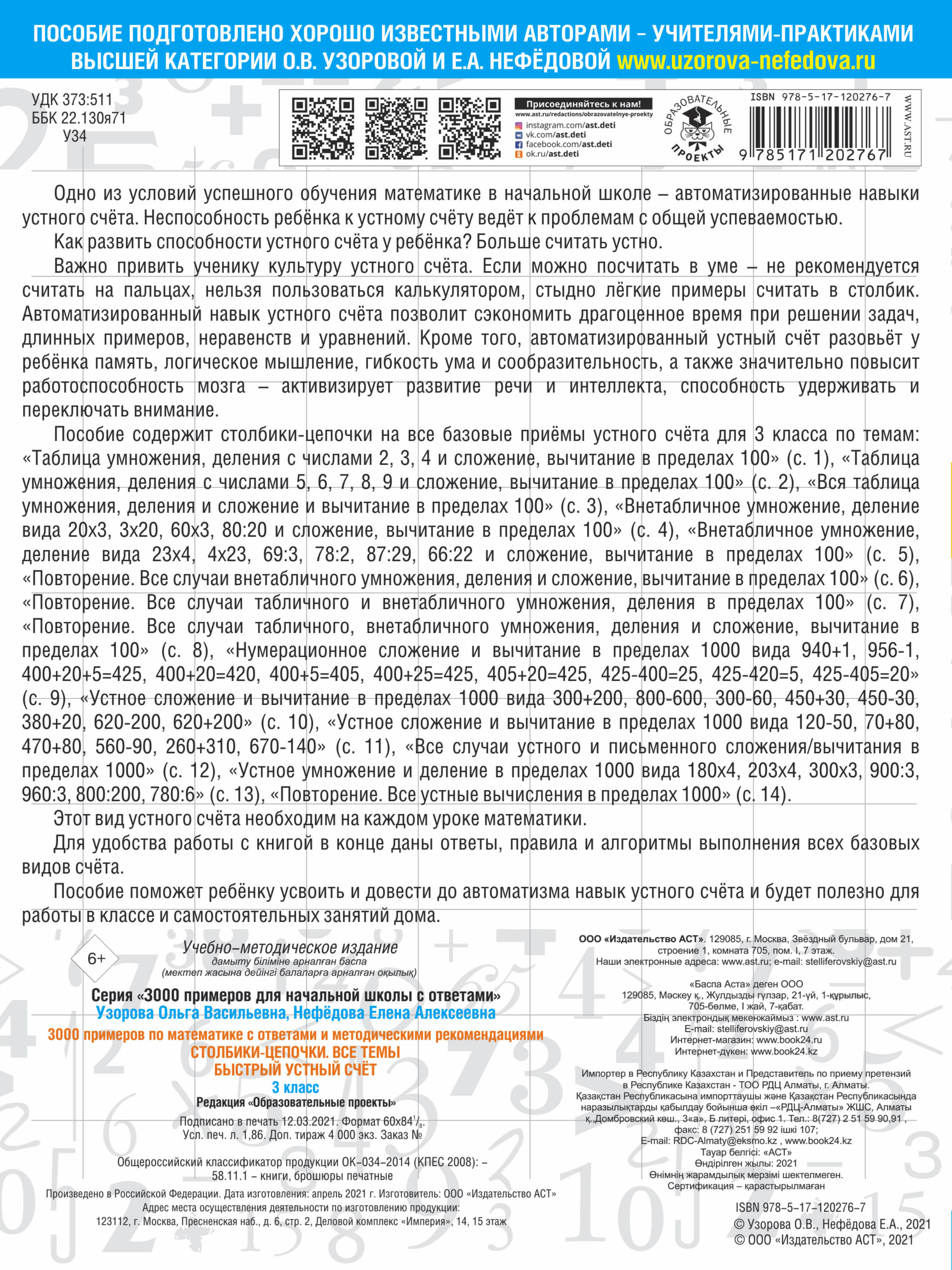 Аннотация: 3000 примеров по математике с ответами и методическими рекомендациями. Столбики-цепочки. Все темы. Быстрый устный счёт. 3 класс