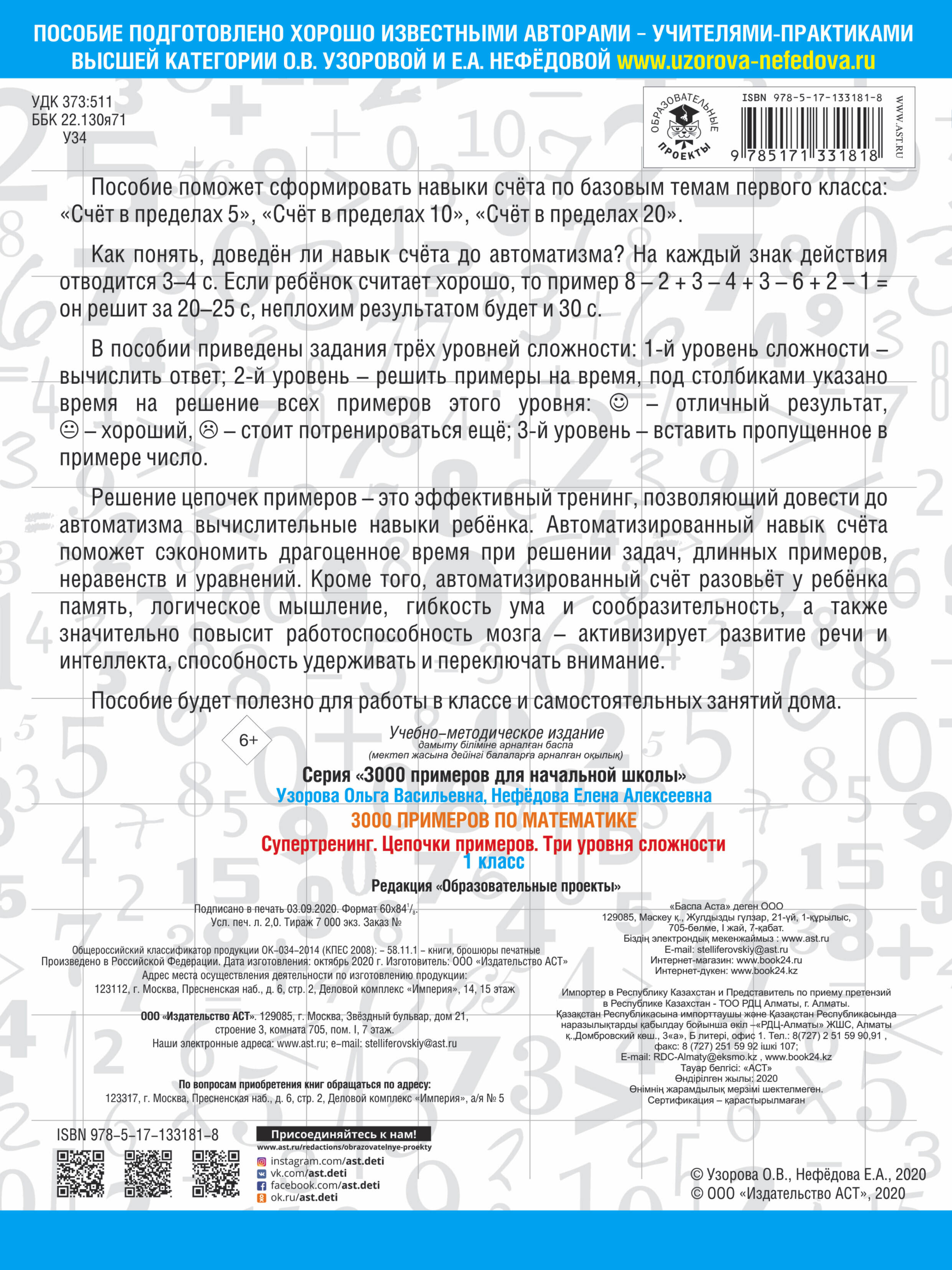 Пособие поможет сформировать навыки счёта по базовым темам первого класса: «Счёт в пределах 5», «Счёт в пределах 10», «Счёт в пределах 20». Решение цепочек примеров - это эффективный тренинг, позволяющий довести до автоматизма вычислительные навыки ребёнка. Автоматизированный навык счёта поможет сэкономить драгоценное время при решении задач, длинных примеров, неравенств и уравнений. Кроме того, автоматизированный счёт разовьёт у ребёнка память, логическое мышление, гибкость ума и сообразительность, а также значительно повысит работоспособность мозга - активизирует развитие речи и интеллекта, способность удерживать и переключать внимание. Пособие будет полезно для работы в классе и самостоятельных занятий дома.| Издательство | ИЗДАТЕЛЬСТВО "АСТ" |