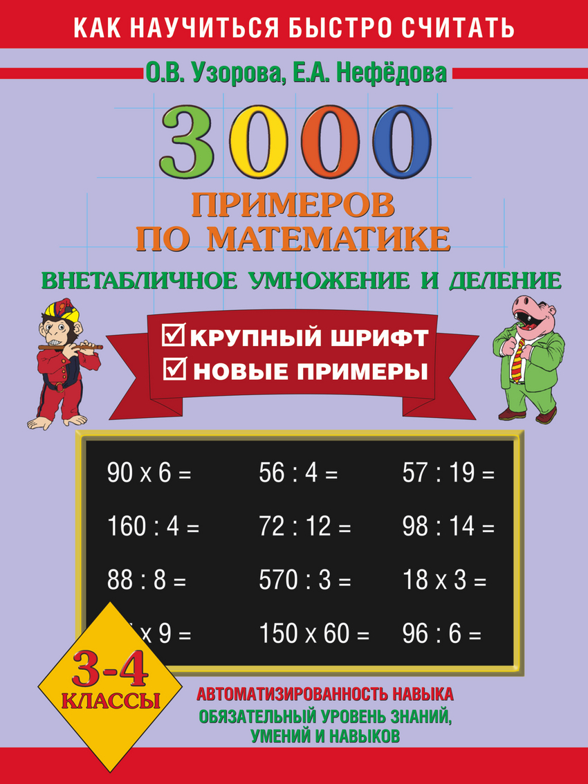 В пособии собраны 3000 новых примеров по математике по одной из базовых тем - «Внетабличное умножение и деление». Как и любая другая тема, она требует внимательного осмысления и прочного закрепления. Особенностью этого издания является крупный шрифт. Как показывает практика, ученик полностью усвоил тему, если решает пример и записывает ответ в течение 4-7 секунд. В этом случае можно говорить, что навык счета доведен до автоматизма. На каждой странице приведены 6-7 столбиков, в среднем по 35 примеров. В конце столбика записывается время, потраченное учеником на решение. В левом нижнем углу обозначены контрольные цифры: идеальное время решения одного столбика, удовлетворительное и результат, который должен заставить ученика задуматься. Учителю сложно проверить такое количество примеров, поэтому лучше, если время, затраченное на решение каждого столбика, отметят взрослые дома. Чтобы достичь хороших результатов, каждый день нужно решать по одной странице. Пособие можно использовать в качестве дополнительного материала на уроках математики, а также для занятий дома.