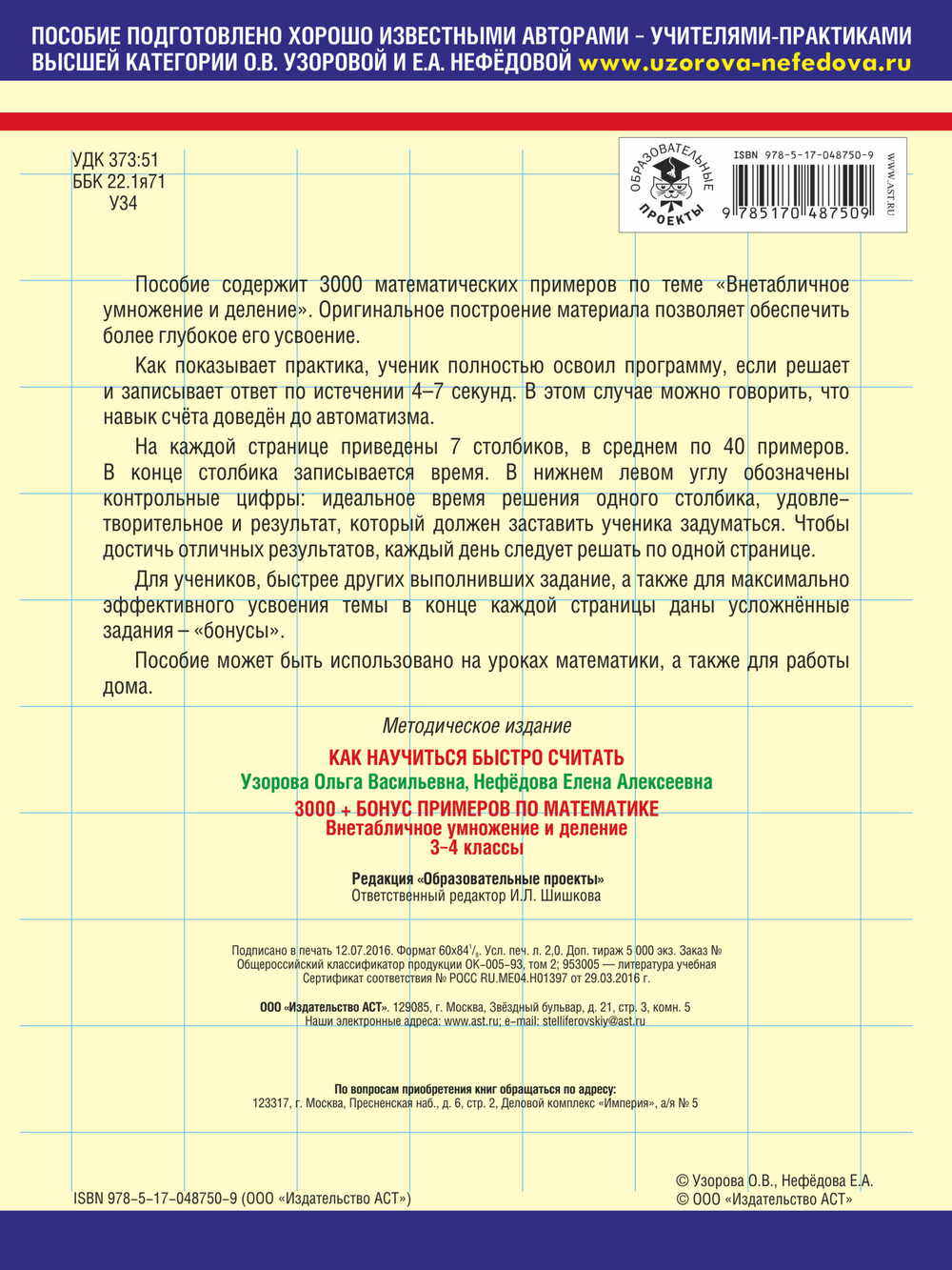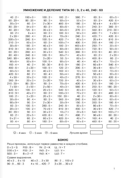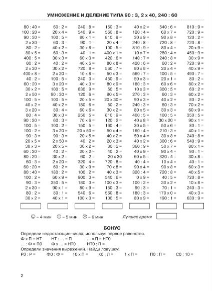 Пособие содержит 3000 примеров по математике. Тема «Внетабличное умножение и деление» - одна из базовых тем, изучаемых в третьем и четвертом классах. Как и любая другая, она требует внимательного осмысления и хорошего закрепления. Как показывает практика, ученик полностью освоил тему, если решает пример и записывает ответ в течение 4-7 секунд. В этом случае можно говорить, что навык счета доведен до автоматизма. На каждой странице приведены 6-7 столбиков по 43 примера каждый. В конце столбика записывается время, потраченное учеником на решение. В левом нижнем углу обозначены контрольные цифры: идеальное время решения одного столбика, удовлетворительное и результат, который должен заставить ученика задуматься. Учителю сложно проверить такое большое количество примеров, поэтому лучше, если время, затраченное на решение каждого столбика, отметят взрослые дома. Чтобы достичь хороших результатов, каждый день нужно решать по одной странице.