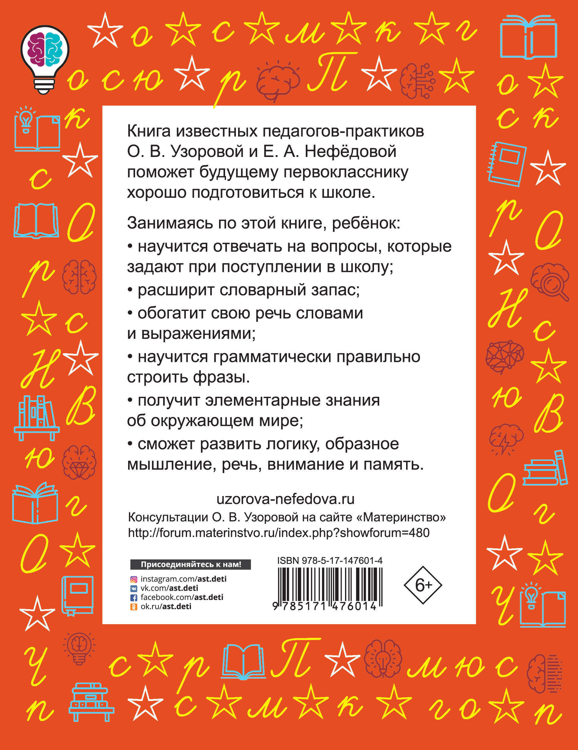 О чём эта книга В пособии много упражнений, которые помогут ребёнку научиться правильно, грамотно и красиво говорить. Кому эта книга будет интересна Детям дошкольного возраста. Каковы особенности этой книги • Благодаря многообразию упражнений дошкольник научится грамотно и правильно говорить. • Содержит примеры и упражнения, которые помогут ребёнку составлять рассказы по картинке, правильно формулировать свои мысли, научиться проговаривать скороговорки. • Поможет расширить словарный запас. • Окажет неоценимую помощь в подготовке к школе.| Издательство | ИЗДАТЕЛЬСТВО "АСТ" |