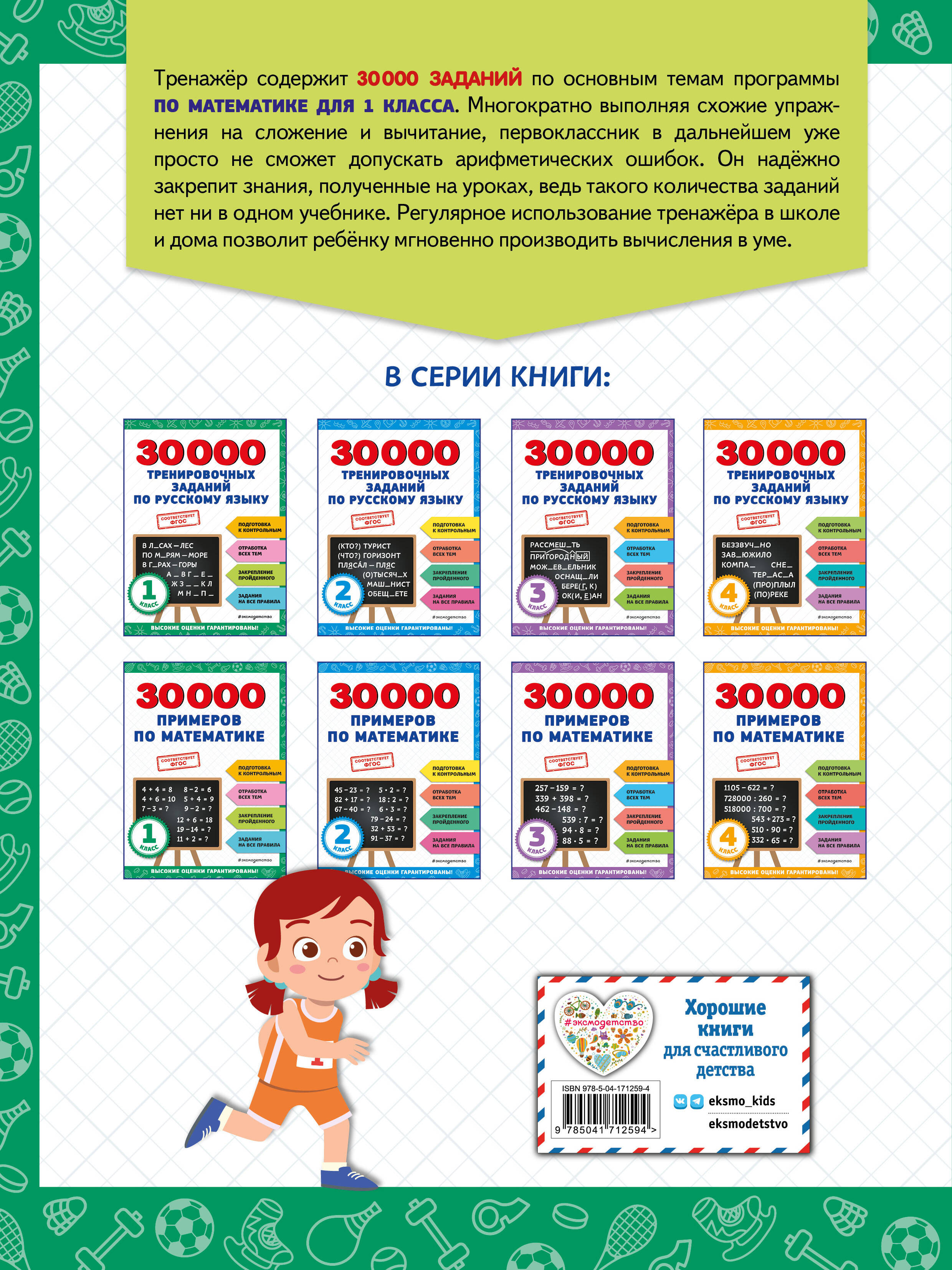 Наиболее действенный способ научиться считать быстро и без ошибок - систематическое повторение. Задания на каждое математическое действие необходимо выполнять многократно, чтобы довести навык устного счёта до полного автоматизма. Ученику предлагается выполнить 30 000 заданий по основным темам программы математики для 1 класса. Выполнив такое количество примеров, школьник надёжно закрепит полученные знания. В дальнейшем он гарантированно сумеет их применить, выполняя самостоятельную, проверочную или просто домашнюю работу. Регулярно работая с тренажёром, первоклассник: • научится считать быстро и без ошибок; • сумеет оценить уровень своих знаний и добиться его повышения; • получит первый опыт оценки проделанной работы.| Издательство | ООО "Издательство "Эксмо" |