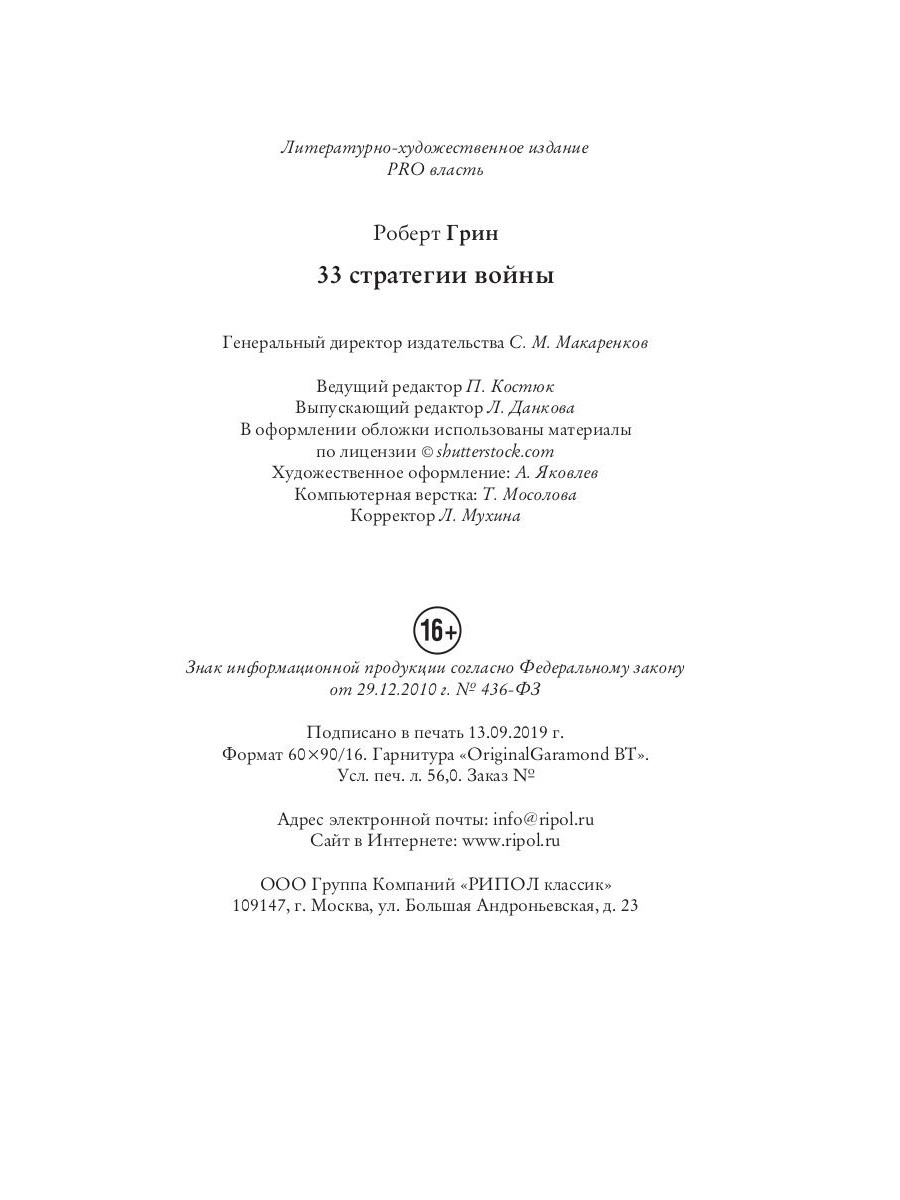 Война и способы ее ведения обладают непреклонной, неумолимой логикой: если вы чего-то хотите или к чему-то стремитесь, то должны быть готовы сразиться за это. Владение стратегическим искусством войны сделает вашу жизнь более спокойной, мирной и плодотворной, ведь вы будете знать, каковы правила игры, и сумеете одерживать победы, не прибегая к насилию. «33 стратегии войны» от Роберта Грина, искушенного знатока человеческой психологии и автора мирового бестселлера «48 законов власти», помогут вам найти выход из любого сложного положения и принять правильное решение. Войну - как и любой другой конфликт - ведут и выигрывают благодаря стратегическому искусству.| Издательство | Рипол Классик |
