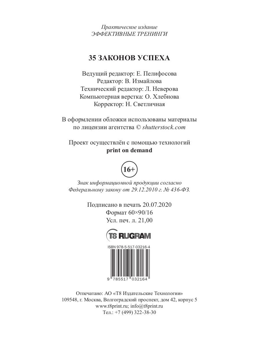 Успех сопутствует в жизни не всем и не всегда, но его все же можно догнать и превратить в своего союзника во всех делах - как в карьере, так и в семейной жизни. Достижение успеха - это своего рода искусство, у которого есть свои законы, обеспечивающие достижение заветной цели. Эта книга призвана помочь каждому, кто неутомим в своем стремлении к успеху. В нее вошли основные законы, призванные помочь читателю научиться успешно жить, невзирая ни на что.| Издательство | Т8 RUGRAM |