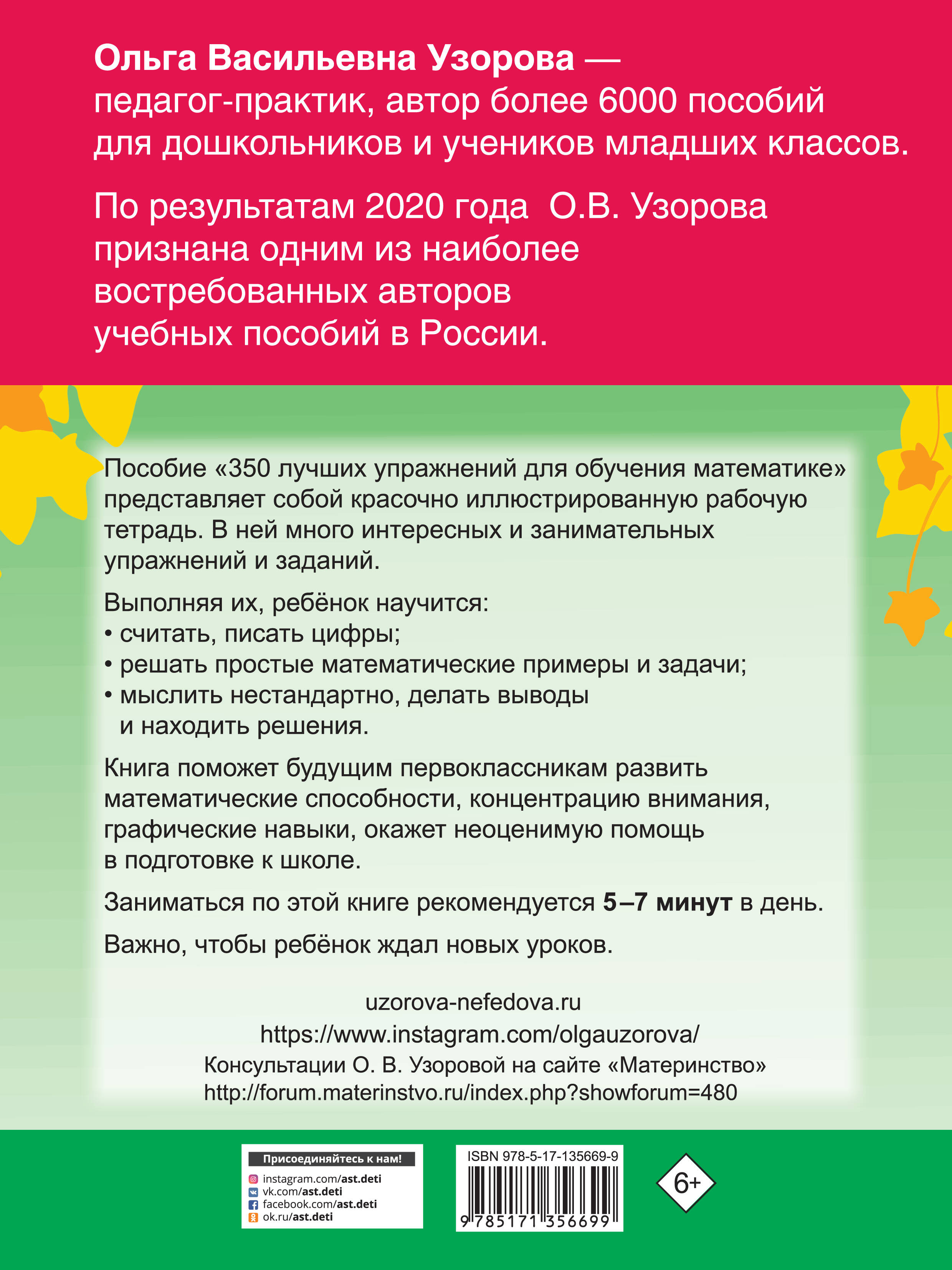 О чём эта книга «350 лучших упражнения для обучения математике» - это эффективный комплекс занятий по математике, основанный на уникальной методике О. В. Узоровой. Занимаясь по книге, школьники повторят пройденный материал, освоят новые темы и успешно подготовятся к сдаче контрольных и проверочных работ. Кому эта книга будет интересна Пособие для учащихся начальной школы. Каковы особенности этой книги • Автор пособия - О. В. Узорова, известный педагог-практик, автор более 6 000 пособий для дошкольников и учеников младших классов. • Более 350 эффективных упражнений по математике. • Пособие подходит для занятий дома и в классе.| Издательство | ИЗДАТЕЛЬСТВО "АСТ" |
