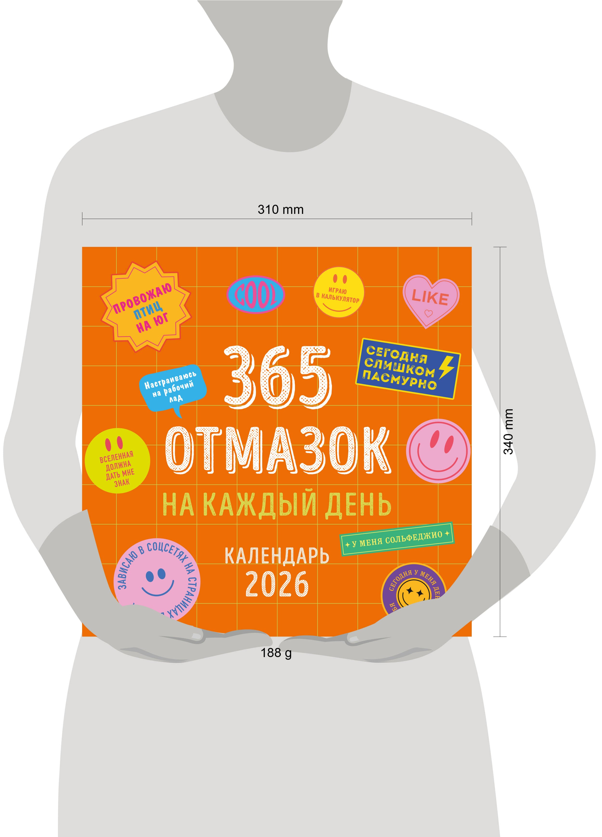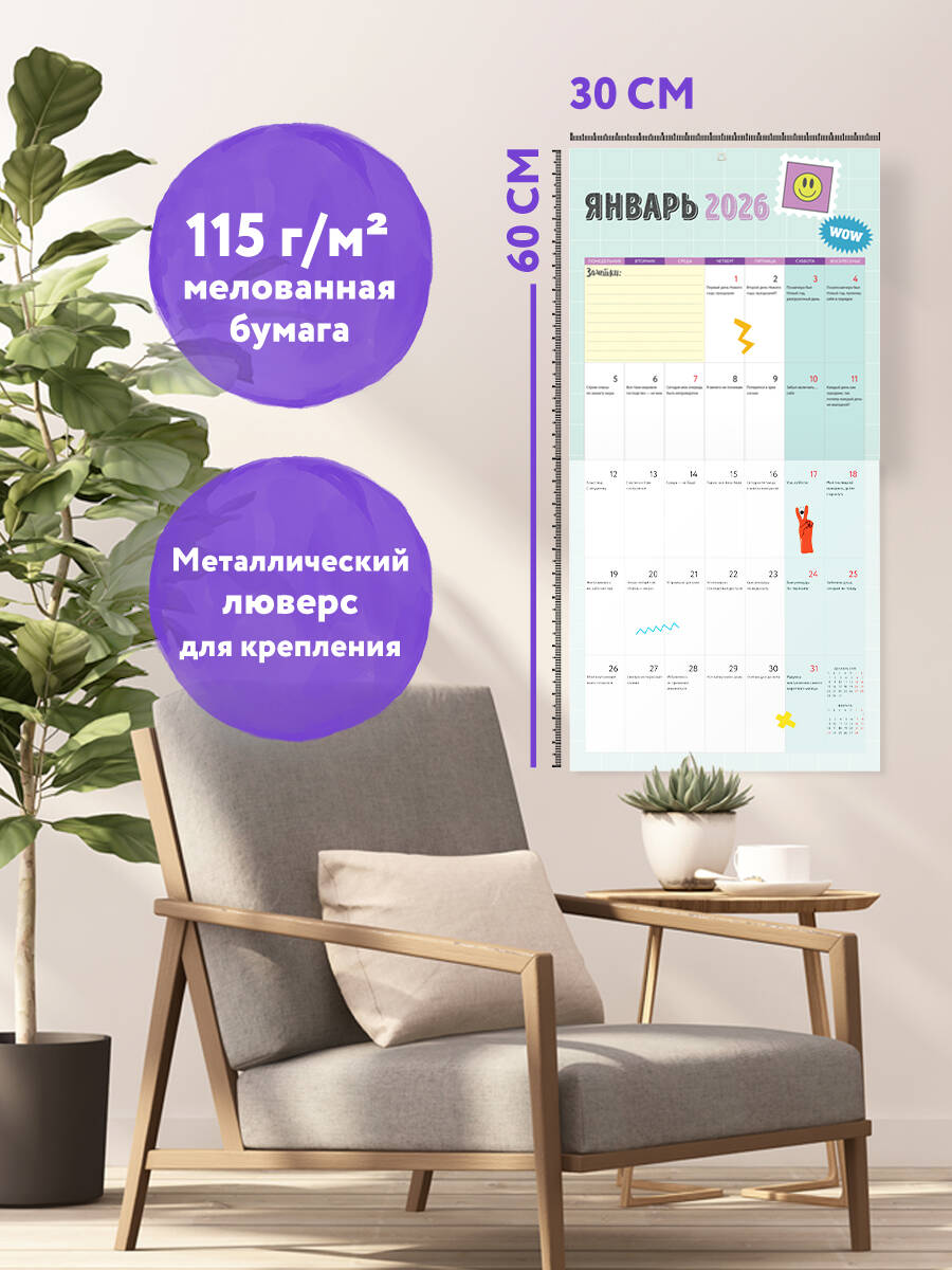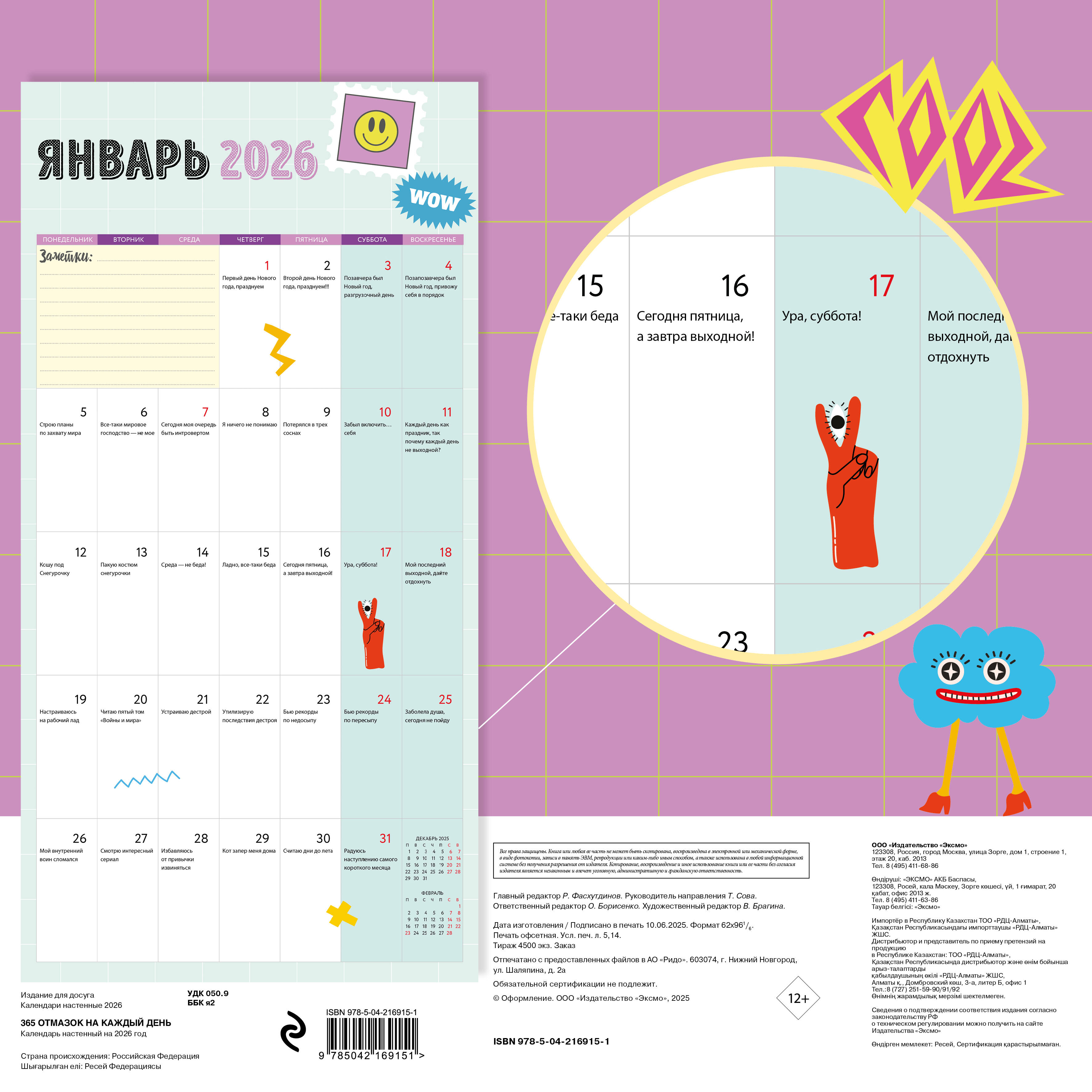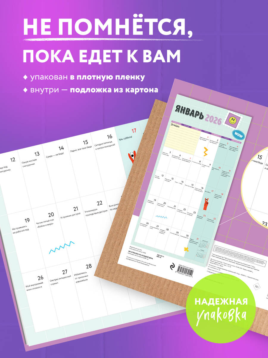 О серии: Наши настенные календари отличаются высоким качеством исполнения! Тщательно подобранные иллюстрации, напечатанные на глянцевой бумаге высочайшего качества, станут настоящим украшением дома, а в календарной сетке найдется место для ваших планов: большие клетки позволят делать записи и организовать свой год! В календаре также отмечены все государственные праздники. В серии настенных календарей издательства «ЭКСМО» каждый найдет тему по вкусу: великие художники, подборки с самыми знаменитыми произведениями искусства, легендарные кинематографические саги и игры, главные книжные авторы и бестселлеры, фотографии и иллюстрации любимых животных и многое-многое другое! О календаре: Каждый день - новая отмазка, которая подойдет для самых разных случаев для тех, кто не хочет ничего делать. Для кого: Для ярких, креативных людей с чувством юмора. Технические параметры: - Тип календаря - настенный перекидной. - Год - 2026. - Календарная сетка - с разбивкой по месяцам. - Вид скрепления - скрепка. - Ширина - 30 см. - Высота - 30 см. - Внутренний блок - мелованная бумага 115 г/м2. - Подложка - плотный гофрокартон для поддержания формы. - Индивидуальная упаковка в плотный целлофановый пакет.| Издательство | ООО "Издательство "Эксмо" |