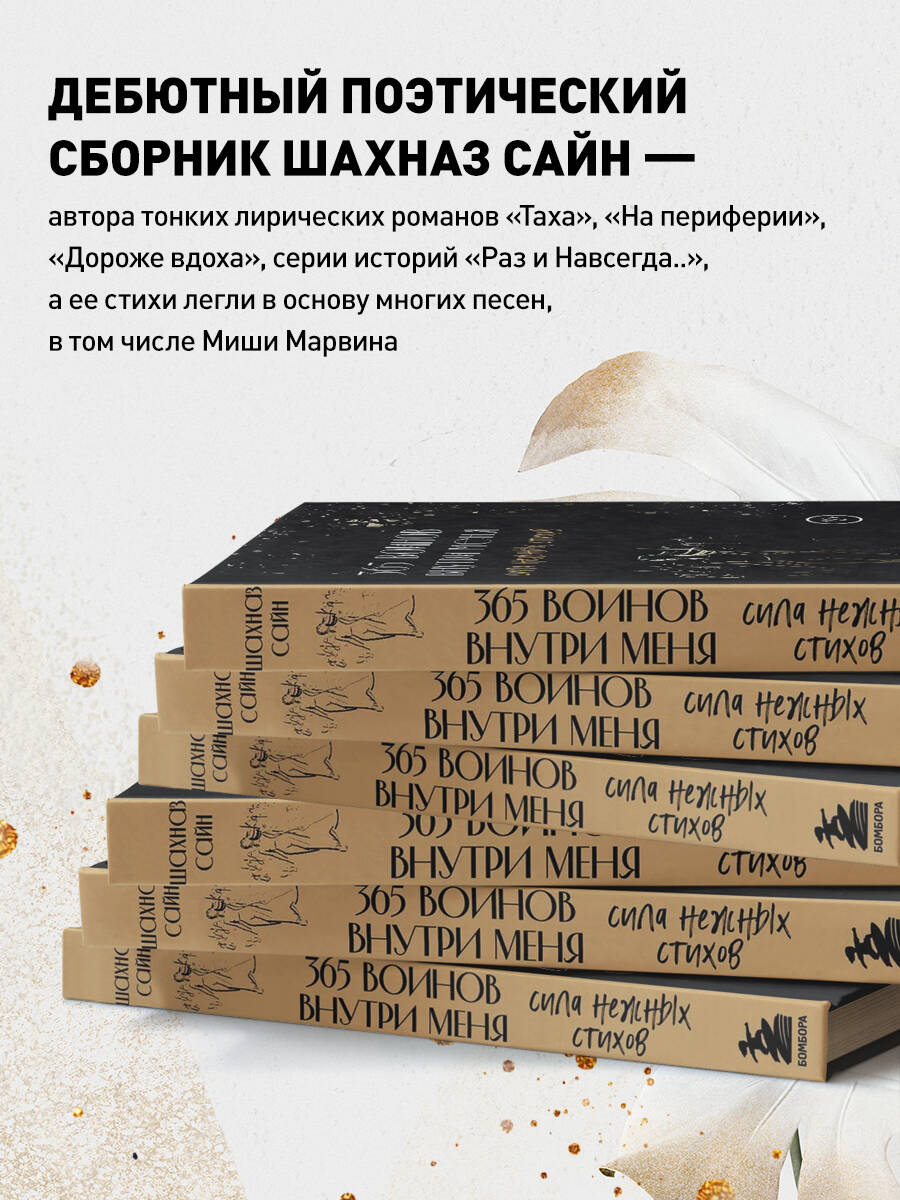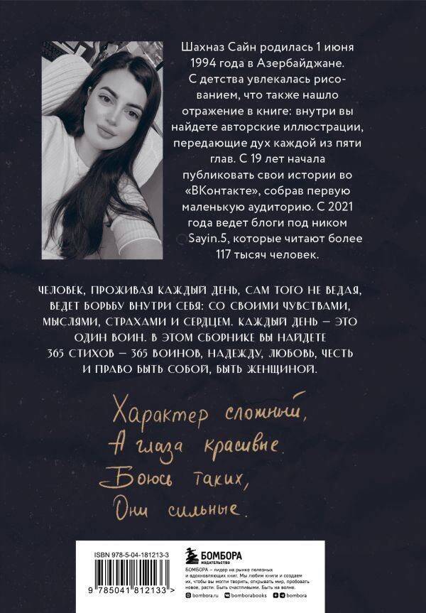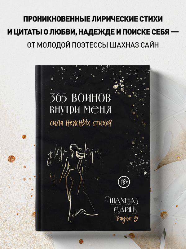 «365 воинов внутри меня» - это сборник молодой поэтессы Шахназ Сайн. Она начала опубликовать свои истории во «ВКонтакте» с 19 лет, собрав первую маленькую аудиторию. Позже ее узнали как автора тонких лирических романов «Таха», «На периферии», «Дороже вдоха», серии историй «Раз и Навсегда..», а ее стихи легли в основу многих песен, в том числе Миши Марвина. С 2021 года поэтесса ведет блог @sayin.5, который читают более 117 тысяч человек. Книга Шахназ состоит из 365 стихов и цитат, объединенных в пять глав: • О любви • Откровение • Голос • Женщина-воин • О важном Человек, проживая каждый день, сам того не ведая, ведет борьбу внутри себя: со своими чувствами, мыслями, страхами и сердцем. Каждый день - это один воин. Его состояние, сила и слабость, которые они проживают вместе. Каждый день - это воин, который позволяет человеку сделать выбор: идти дальше или стоять на месте. Ибо каждый воин - это урок, который человек обязан пройти.| Издательство | ООО "Издательство "Эксмо" |