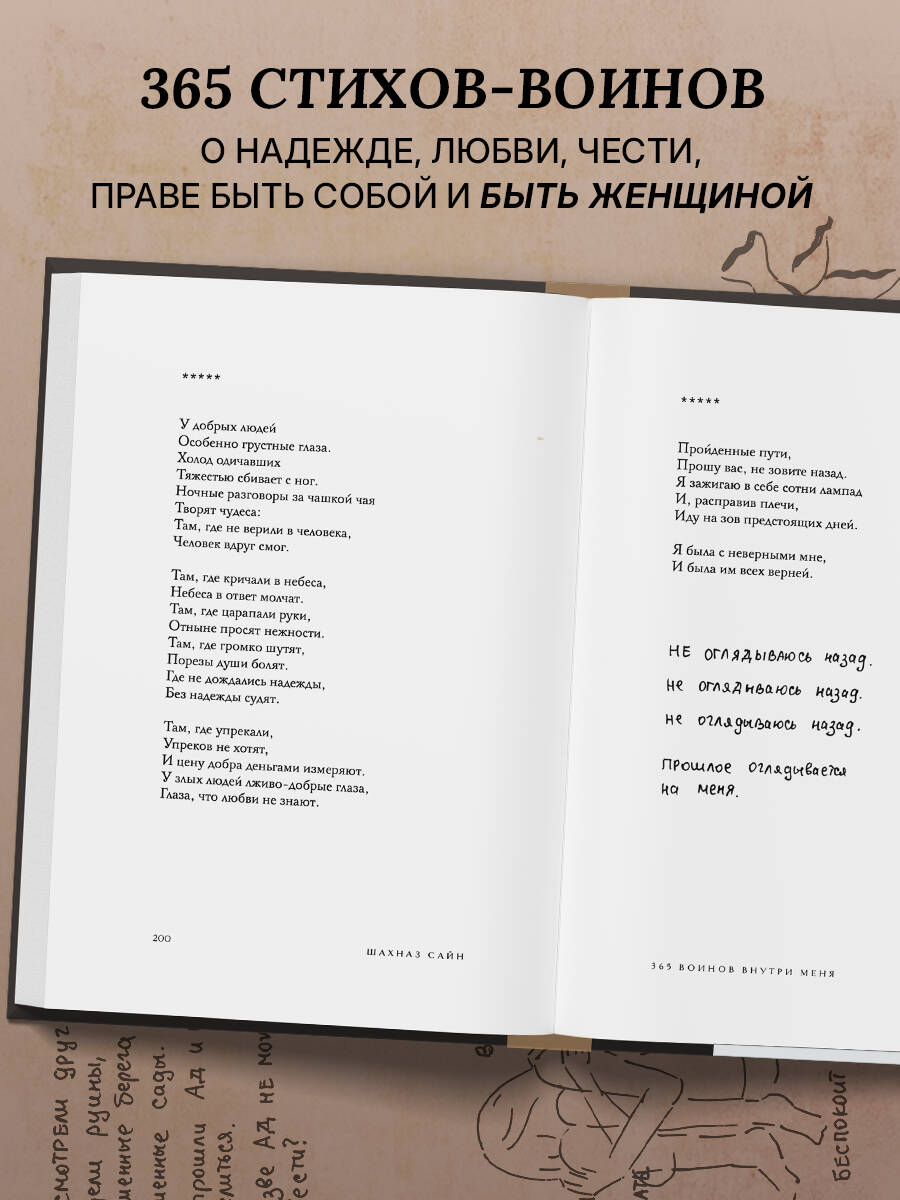 Уникальное и очень личное издание бестселлера «365 воинов внутри меня». Шахназ украсила его своими иллюстрациями и добавила небольшие вдохновляющие послания читателям. Все подписи и рисунки были сделаны автором вручную и бережно перенесены дизайнером на страницы книги. «365 воинов внутри меня» - это сборник молодой поэтессы Шахназ Сайн. Она начала опубликовать свои истории во «ВКонтакте» с 19 лет, собрав первую маленькую аудиторию. Позже ее узнали как автора тонких лирических романов «Таха», «На периферии», «Дороже вдоха», серии историй «Раз и Навсегда...», а ее стихи легли в основу многих песен, в том числе Миши Марвина. С 2021 года поэтесса ведет блог @sayin.5, который читают более 117 тысяч человек. Книга Шахназ состоит из 365 стихов и цитат, объединенных в пять глав: • О любви • Откровение • Голос • Женщина-воин • О важном Человек, проживая каждый день, сам того не ведая, ведет борьбу внутри себя: со своими чувствами, мыслями, страхами и сердцем. Каждый день - это один воин. Его состояние, сила и слабость, которые они проживают вместе. Каждый день - это воин, который позволяет человеку сделать выбор: идти дальше или стоять на месте. Ибо каждый воин - это урок, который человек обязан пройти.