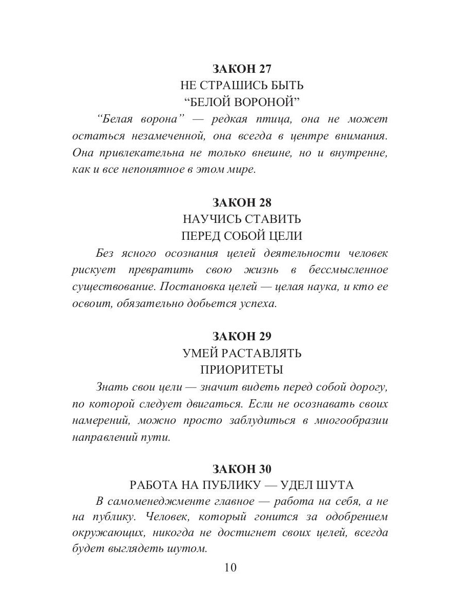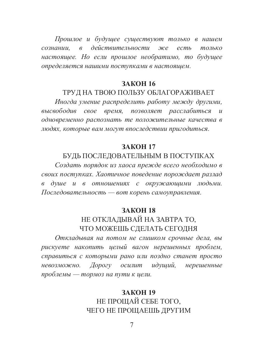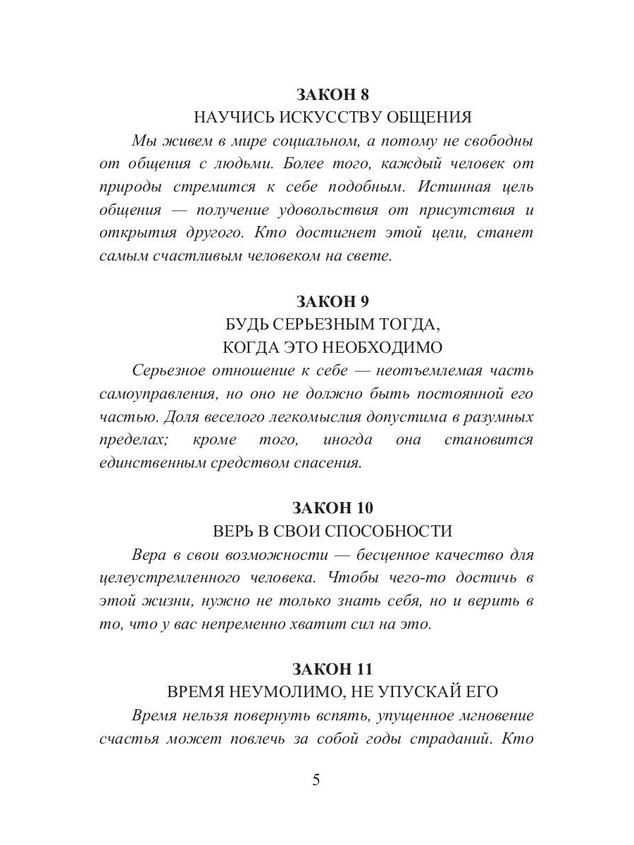 В книге собраны законы управления собой, которые помогут читателю обрести власть над собой, эффективно управлять людьми, радоваться жизни, идти к успеху, строить свою жизнь так, как человек считает нужным. Каждый закон сопровождается историческим материалом, который подтверждает эффективность закона. Обратная сторона закона предостережет читателя от возможного злоупотребления искусством самоуправления.| Издательство | Т8 RUGRAM |