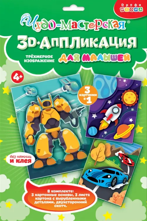3D-аппликация - современный и очень увлекательный вид творчества. В наборе вы найдёте всё для создания трёх объёмных поделок. Готовые детали аппликации из плотного картона нужно наклеить на картинку с помощью объёмного двустороннего скотча. Клей и ножницы не нужны. Яркие красочные детали, наклеенные в несколько слоёв, придадут плоскому изображению 3D-эффект. Ребёнок справится с поделкой самостоятельно, ведь в комплект входит пошаговая инструкция.
