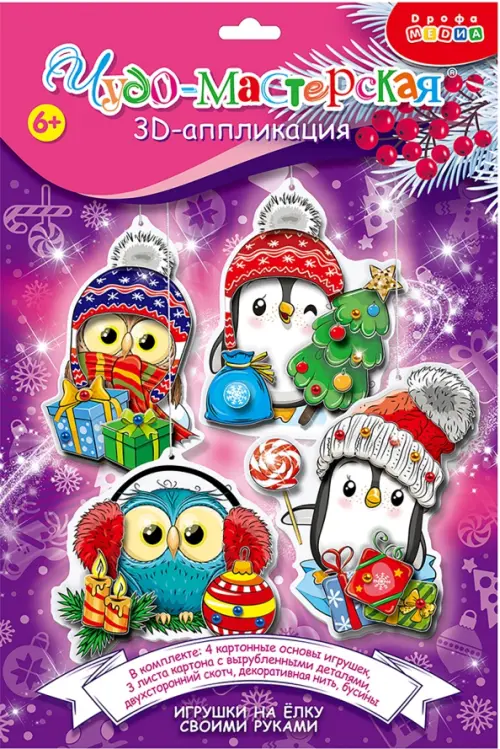 В наборе четыре 3D-игрушки, которые ребёнок легко сделает самостоятельно. Клей и ножницы не нужны - детали для приклеивания уже вырублены, достаточно аккуратно выдавить их из основы, и приклеить на игрушку объёмным двухсторонним скотчем. Детали наклеивают в несколько слоёв, что придаёт плоскому изображению эффект объёма. Новогодние 3D-игрушки - весёлые совы и задорные пингвинчики - будут замечательно смотреться на ёлке!