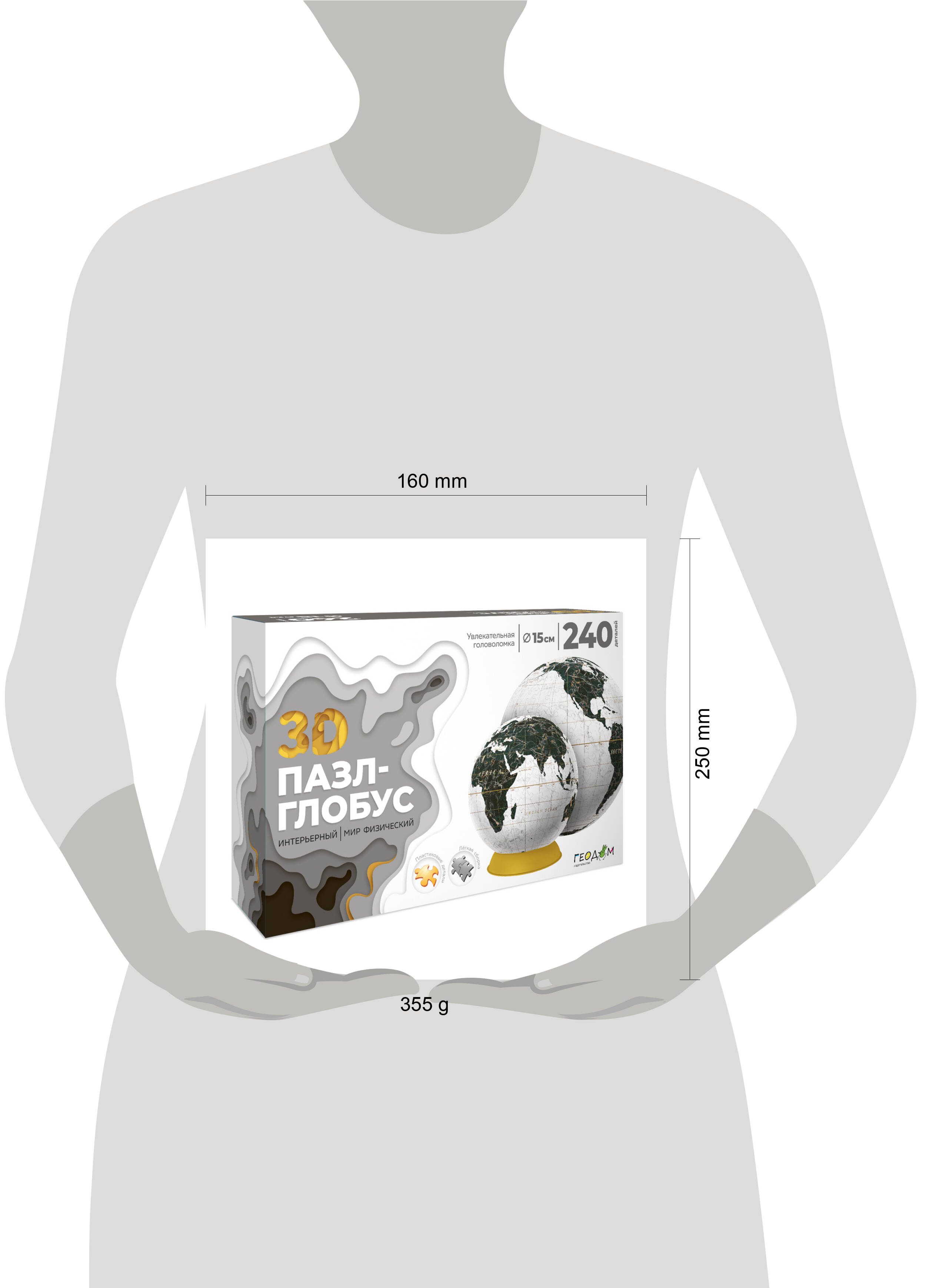 Аннотация: 3D Пазл-глобус. Мир физический. Интерьерный белый. 240 деталей. Диаметр 15 см. ГЕОДОМ