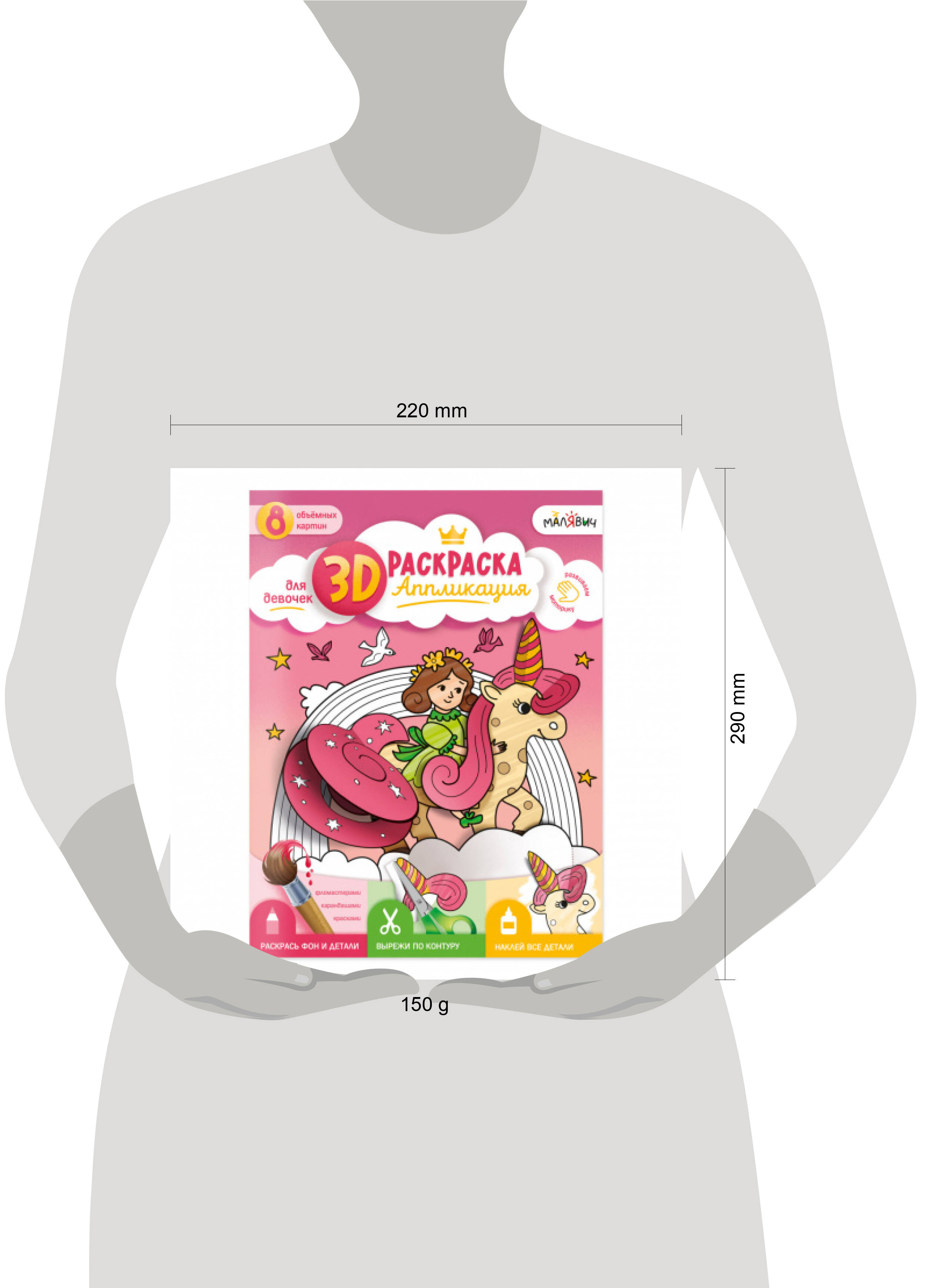"3D-раскраска-аппликация. Для девочек" под брендом "МалЯвич" - это творческая тетрадь для создания объёмных картин! Внутри 8 картинок принцесс и детали к ним. Раскрасьте, вырежьте, приклейте - и полюбуйтесь результатом! Готовые картины можно подарить друзьям, украсить ими комнату или устроить выставку. Рекомендовано для детей дошкольного возраста.