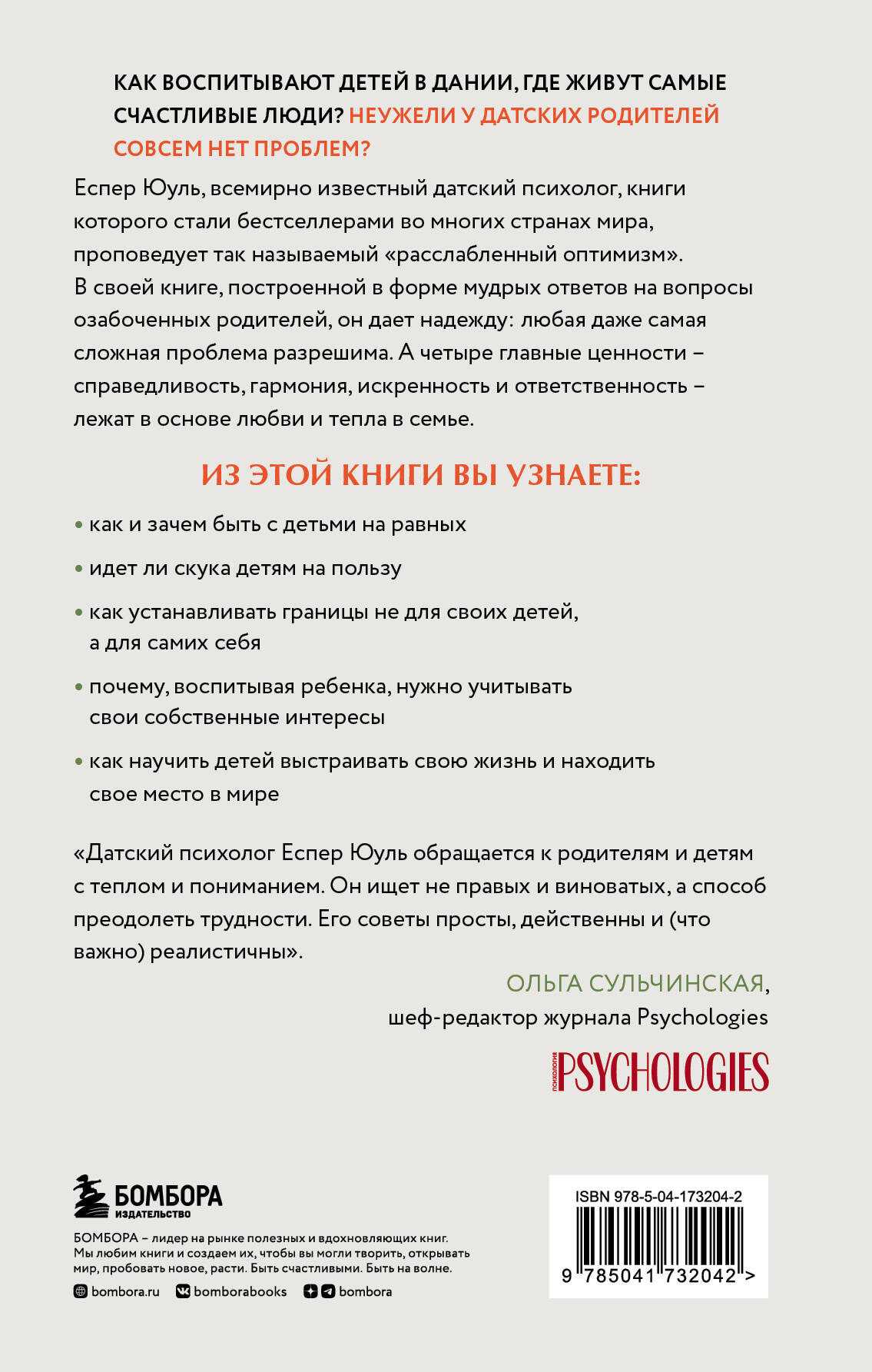 Как воспитывают детей в Дании, где живут самые счастливые люди? Неужели у датских родителей совсем нет проблем? Еспер Юуль, всемирно известный датский психолог, книги которого стали бестселлерами во многих странах мира, проповедует так называемый «расслабленный оптимизм». В своей книге, построенной в форме мудрых ответов на вопросы озабоченных родителей, он дает надежду: любая даже самая сложная проблема разрешима. А четыре главные ценности - справедливость, гармония, искренность и ответственность - лежат в основе любви и тепла в семье. ИЗ ЭТОЙ КНИГИ ВЫ УЗНАЕТЕ: • как и зачем быть с детьми на равных; • идет ли скука детям на пользу; • как устанавливать границы не для своих детей, а для самих себя; • почему, воспитывая ребенка, нужно учитывать свои собственные интересы; • как научить детей выстраивать свою жизнь и находить свое место в мире.| Издательство | ООО "Издательство "Эксмо" |
