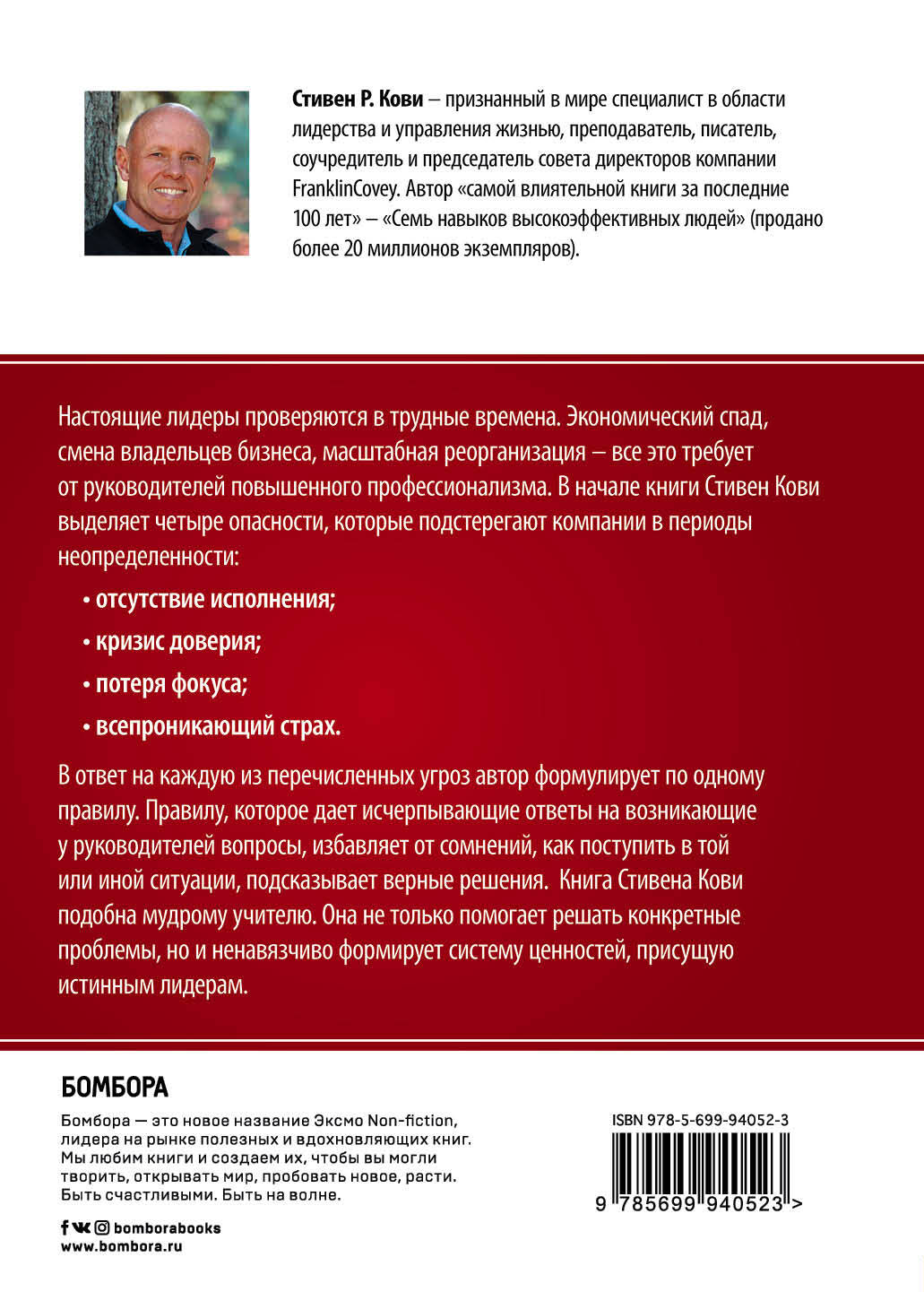 Свою новую книгу Стивен Кови, автор мирового бестселлера "Семь навыков высокоэффективных людей", написал для лидеров компаний, которые сталкиваются с жесткой необходимостью показывать конкретные результаты своей работы в условиях неопределенности. Нестабильность экономики, меняющаяся ситуация на рынке, стремительное развитие новых технологий - лидер компании не может учесть все факторы неопределенности будущего и превратить их в набор определенностей. В таких трудных ситуациях можно опереться на базовые, ключевые правила, принципы действия. Они не меняются и никогда не подведут.