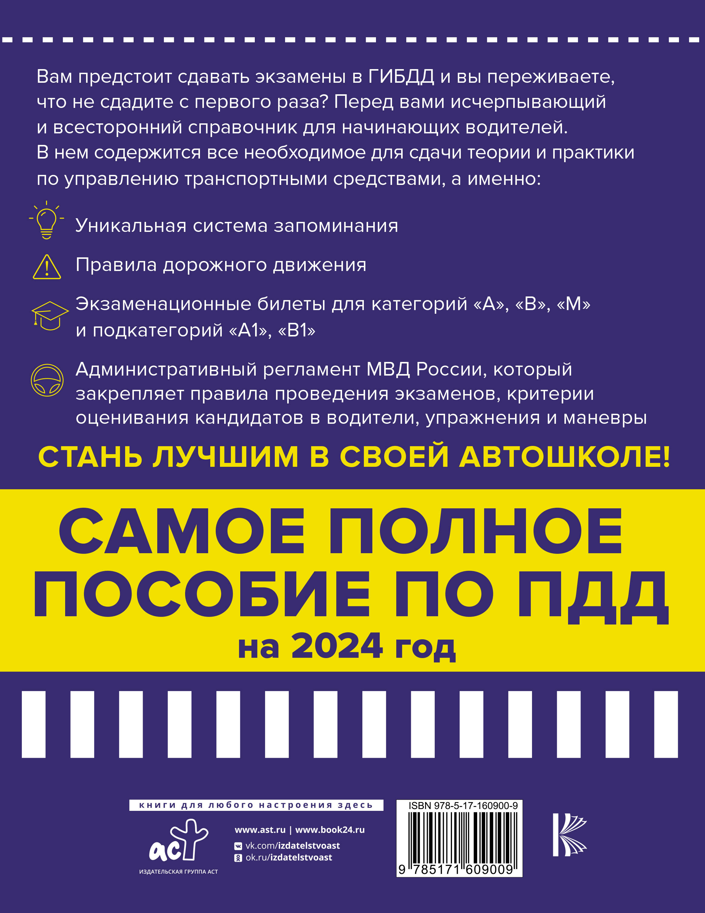 Вам предстоит сдавать экзамены в ГИБДД и Вы переживаете, что не сдадите с первого раза? Перед Вами исчерпывающий и всесторонний справочник для начинающих водителей. В нем содержится все необходимое для сдачи теории и практики по управлению транспортными средствами, а именно: - Уникальная система запоминания, которая поможет Вам быстро и успешно подготовиться к экзаменам в ГИБДД; - Правила дорожного движения на 2024 год с иллюстрациями; - Экзаменационные билеты для категорий "A", "B", "M" и подкатегорий "А1", "B1"; - Таблица штрафов и других санкций за нарушение ПДД; - Правила оказания первой помощи пострадавшим на дороге; - Административный регламент МВД России, который закрепляет правила проведения экзаменов, критерии оценивания кандидатов в водители, упражнения, маневры и многое другое. Издание учитывает все изменения, опубликованные в официальных источниках на момент подписания издания в печать.