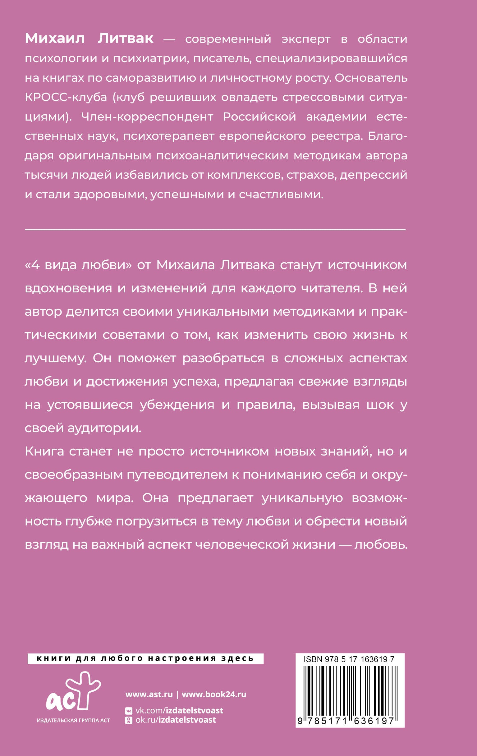 Михаил Литвак - современный эксперт в области психологии и психиатрии, писатель, специализирующийся на книгах по саморазвитию и личностному росту. Основатель КРОСС-клуба (клуб решивших овладеть стрессовыми ситуациями). Член-корреспондент Российской академии естественных наук, психотерапевт европейского реестра. Благодаря оригинальным психоаналитическим методикам автора тысячи людей избавились от комплексов, страхов, депрессий и стали здоровыми, успешными и счастливыми. "4 вида любви" от Михаила Литвака станет источником вдохновения и изменений для каждого читателя. В ней автор делится своими уникальными методиками и практическими советами о том, как изменить свою жизнь к лучшему. Он поможет разобраться в сложных аспектах любви и достижения успеха, предлагая свежие взгляды на устоявшиеся убеждения и правила, вызывая шок у своей аудитории. Книга станет не просто источником новых знаний, но и своеобразным путеводителем к пониманию себя и окружающего мира. Она предлагает уникальную возможность глубже погрузиться в тему любви и обрести новый взгляд на важный аспект человеческой жизни - любовь.| Издательство | Издательство "АСТ" |