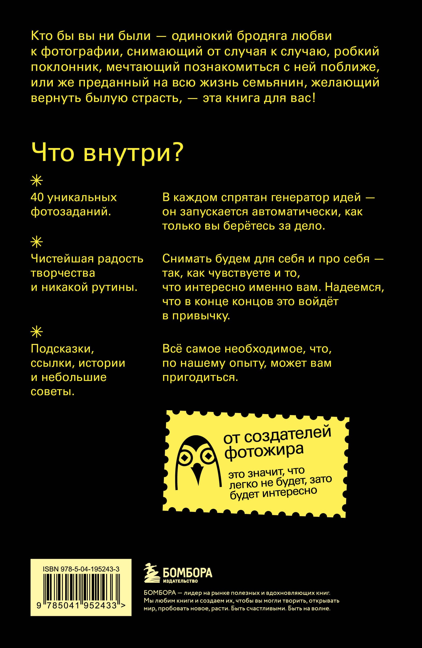 Если вы попали в творческий кризис, то эта книга станет спасением для вас и вашего фотоаппарата! Основатели фотомарафона «Фотожир» (участниками которого стали несколько тысяч человек!) Иван Князев и Александра Кособокова собрали здесь удивительные задания, которые вам точно раньше не встречались. Они помогут вам не только развить воображение, но и открыть новые грани своего творческого «я». Каждое задание наполнено личными и веселыми историями Вани и Саши, которые помогают настроиться на непринужденную творческую волну и научат находить почву для новых идей в повседневных вещах: во дворе, где вы родились, в своем теле, в геометрических фигурах. Выполняйте задания в любое время, отвечайте на вопросы авторов, саморефлексируйте и вдохновляйтесь референсами знаменитых фотографов и художников, изучая их работы по куар-кодам. Не упустите возможность стать лучшим в мире фотографом, который способен увидеть красоту в каждой детали!| Издательство | ООО "Издательство "Эксмо" |