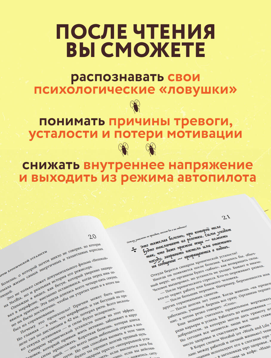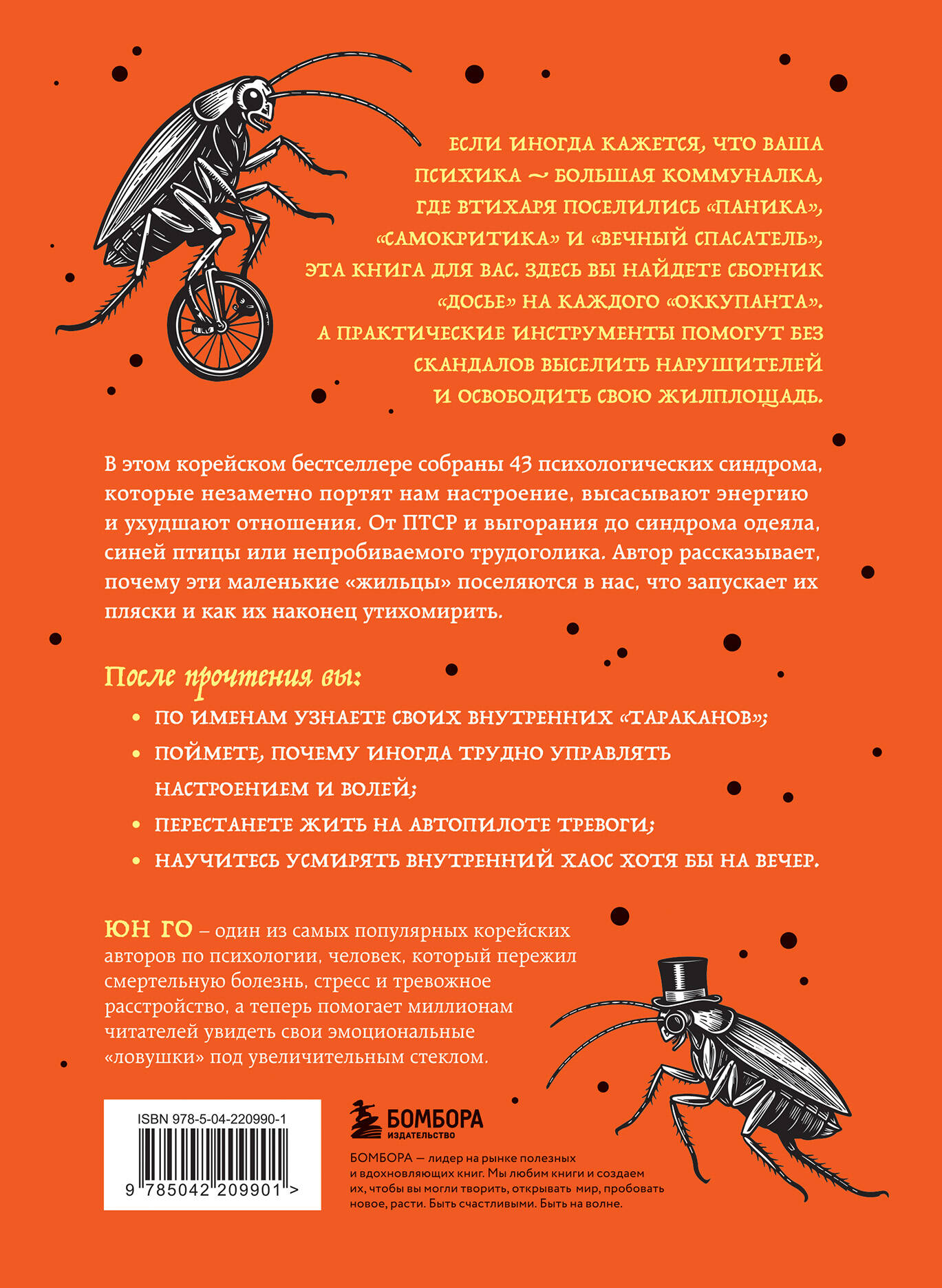 Если иногда кажется, что ваша психика - большая коммуналка, где втихаря поселились «паника», «самокритика» и «вечный спасатель», - эта книга для вас. Здесь вы найдете сборник «досье» на каждого «оккупанта». А практические инструменты помогут без скандалов выселить нарушителей и освободить свою жилплощадь. В этом корейском бестселлере собраны 43 психологических синдрома, которые незаметно портят нам настроение, высасывают энергию и ухудшают отношения. От ПТСР и выгорания до синдрома одеяла, синей птицы или непробиваемого трудоголика. Автор рассказывает, почему эти маленькие «жильцы» поселяются в нас, что запускает их пляски и как их наконец утихомирить. После прочтения вы: • по именам узнаете своих внутренних «тараканов»; • поймете, почему иногда трудно управлять настроением и волей; • перестанете жить на автопилоте тревоги; • научитесь усмирять внутренний хаос хотя бы на вечер. Юн Го - один из самых популярных корейских авторов по психологии, человек, который пережил смертельную болезнь, стресс и тревожное расстройство, а теперь помогает миллионам читателей увидеть свои эмоциональные «ловушки» под увеличительным стеклом.| Издательство | ООО "Издательство "Эксмо" |