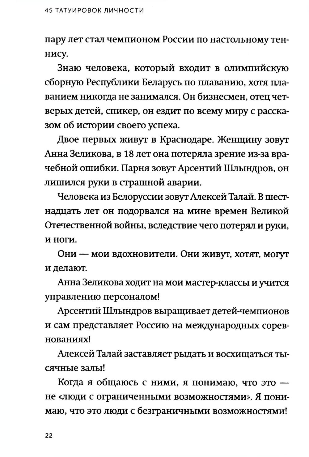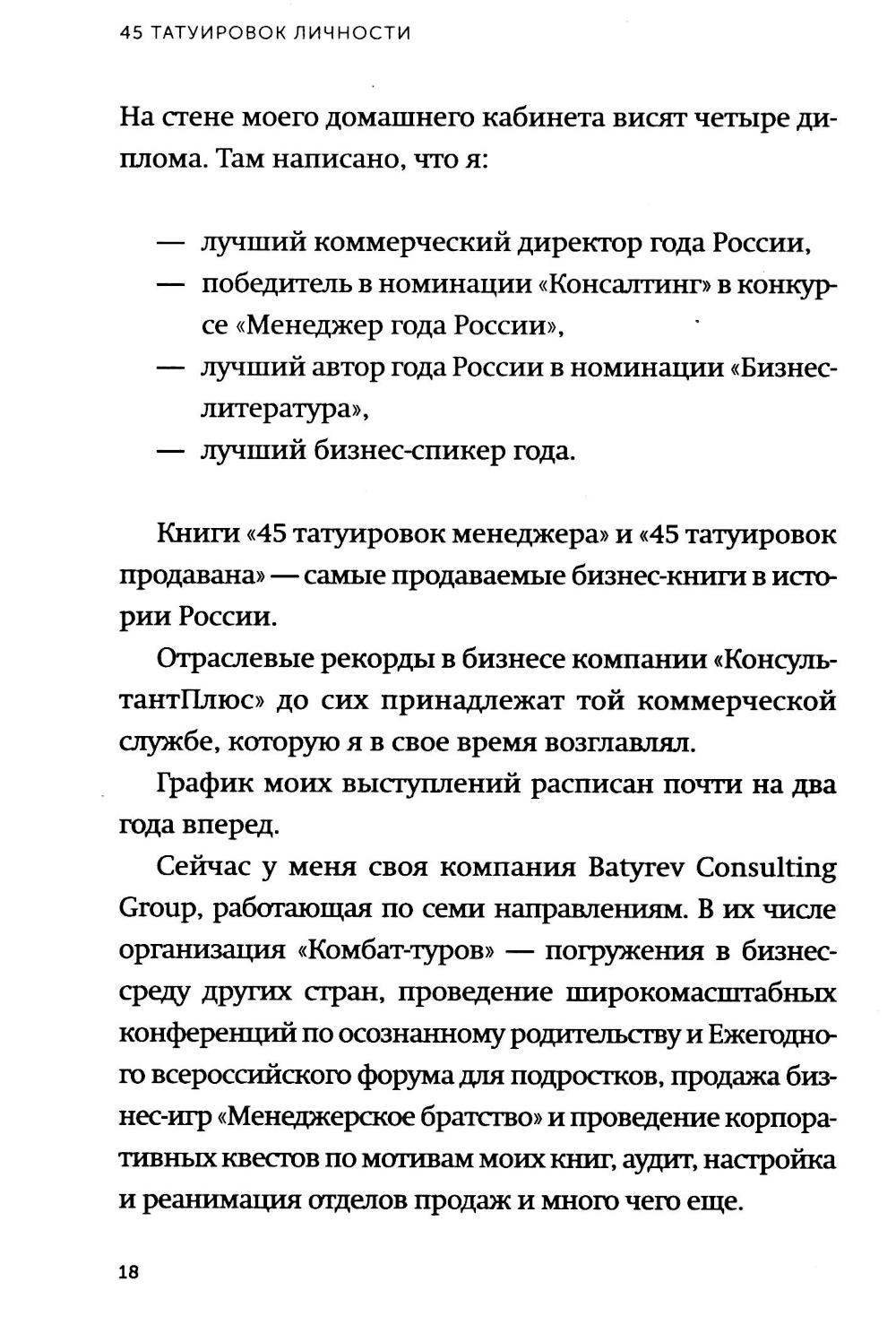Имя Максима Батырева широко известно в российском бизнес-сообществе. Его карьерный путь можно без преувеличения назвать выдающимся. Рядовая должность сотрудника отдела продаж - в начале пути. Собственная компания Batyrev Consulting Group, работающая по семи направлениям, - сегодня. Лучший продавец. Лучший руководитель отдела. Лучший коммерческий директор года России. Лучший автор года России в номинации «Бизнес-литература». Лучший бизнес-спикер года. Автор одних из самых продаваемых бизнес-книг в России - «45 татуировок менеджера» и «45 татуировок продавана». Максим Батырев уверен, что это лишь начало большого жизненного пути. Такие достижения не приходят сами собой. За ними стоит тяжелая работа, ошибки и «шишки», уроки и выводы. Многие из них навсегда врезаются в сердце и сознание, словно татуировки. 45 своих «татуировок», ставших правилами жизни, Максим Батырев открывает в этой книге. Из каждого эпизода жизни он выводит принципы взаимодействия с миром, семьей, самим собой - и все удачи и трудности складываются в картину того, как в любой ситуации оставаться собой и шагать все выше по лестнице саморазвития. Наверняка многие из этих правил вы сможете применить в своей жизни. И наверняка найдете, чем их дополнить.| Издательство | Манн, Иванов и Фербер |