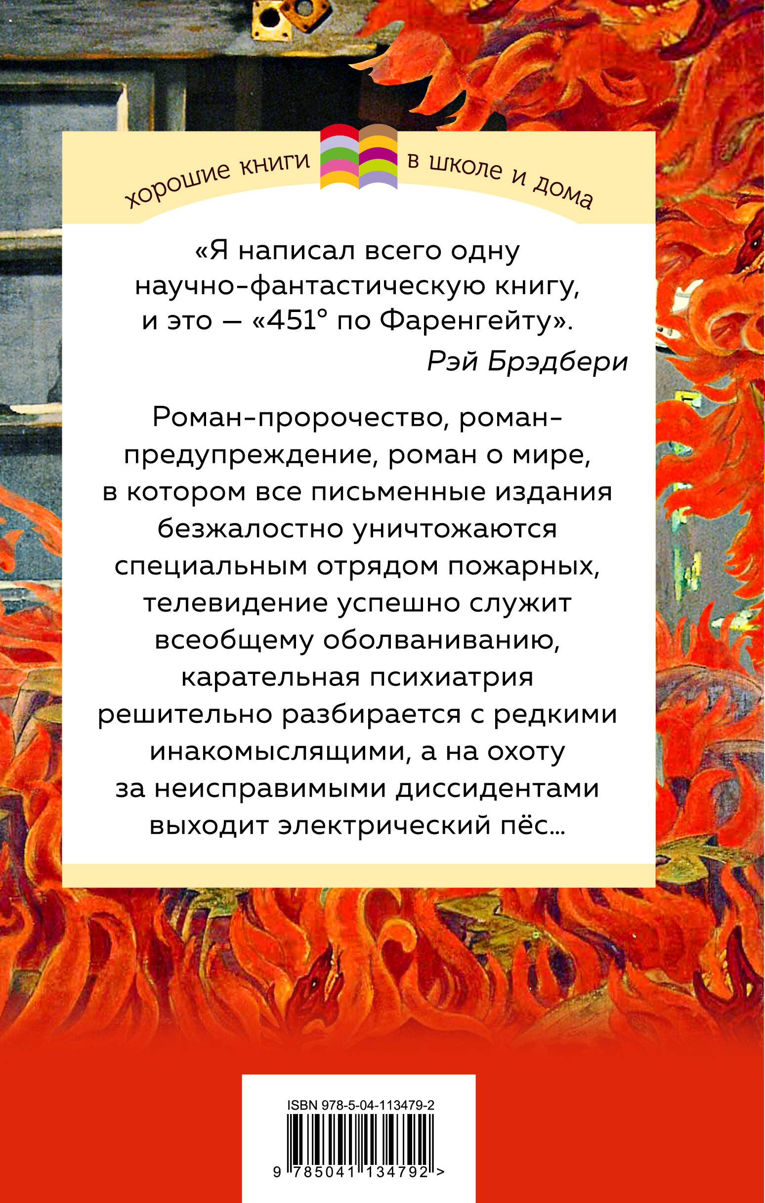 Сенсационным было заявление Брэдбери в 2007 году, что «451° по Фаренгейту» понимают неправильно. Эта книга не о правительственной цензуре, это история о том, как телевидение уничтожает интерес к чтению книг. В начале 1950-х большинство американцев в глаза не видели телевизора, однако Брэдбери предсказал наступление новой эры свободы, достатка и развлечений, когда желание быть счастливым, помноженное на политкорректность, приведет к запрету книг. «Телевизор говорит вам, о чем надлежит думать, и вколачивает это вам в голову. Он всегда и обязательно прав».| Издательство | ООО "Издательство "Эксмо" |