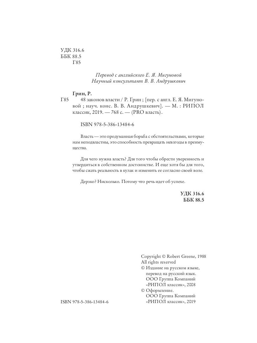 Власть - это продуманная борьба с обстоятельствами, которые нам неподвластны, это способность превращать невзгоды в преимущества. Для чего нужна власть? Для того чтобы обрести уверенность и утвердиться в собственном достоинстве. И еще хотя бы для того, чтобы сжать реальность в кулак и изменить ее согласно своей воле. Дерзко? Нисколько. Потому что речь идет об успехе.| Издательство | Рипол Классик |