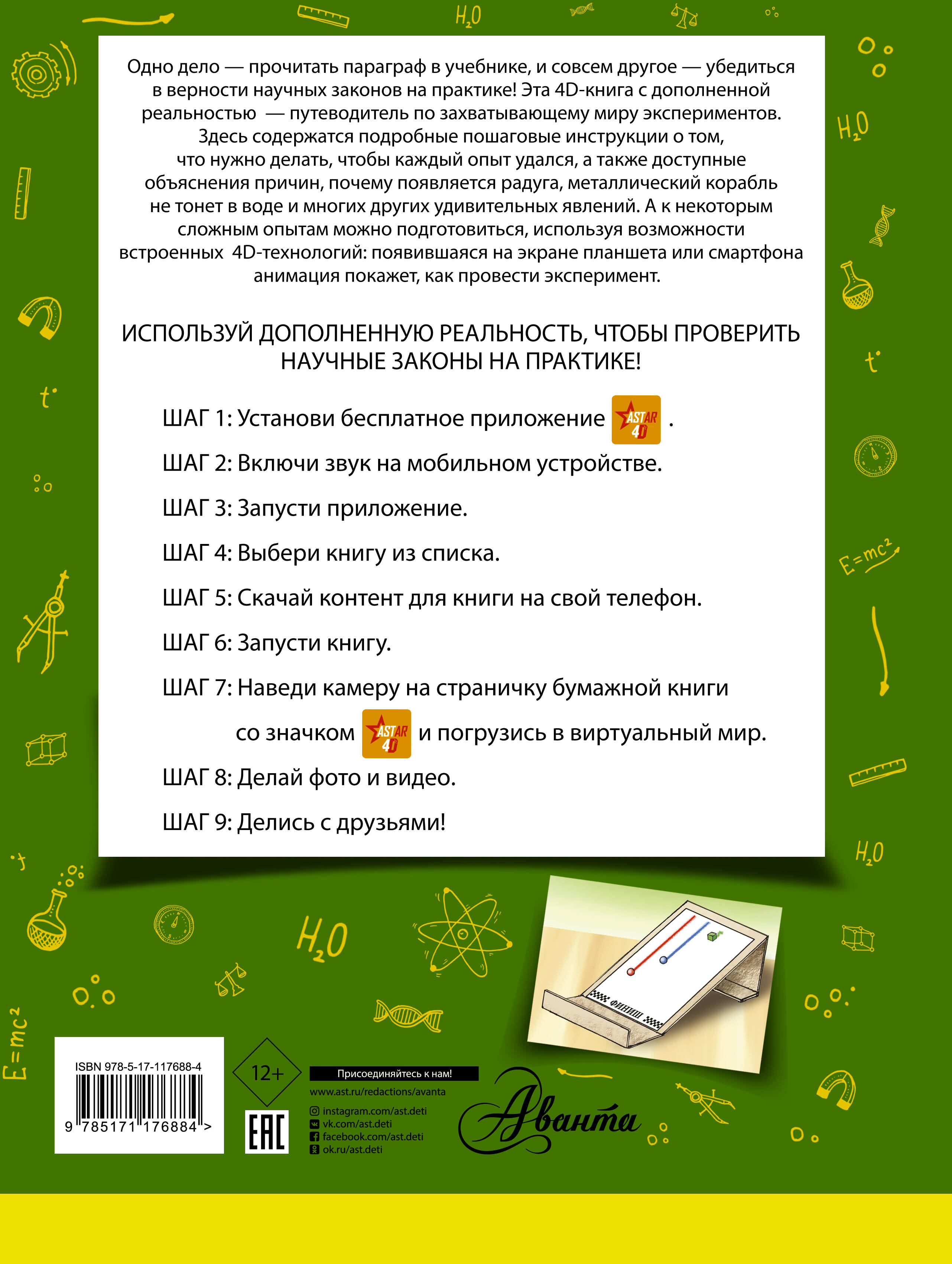 Эта книга адресована самым любознательным ребятам, которые стремятся все проверить на практике - даже научные законы! Хочешь увидеть собственными глазами, как извергается вулкан или действуют силы трения? Если так, все в твоих руках - это издание научит и подскажет, что делать! Сориентироваться по сторонам света, познакомиться с небесным Гераклом, спросить время у Солнца, вычислить теплопроводность веществ с помощью шоколада, вырастить кристаллы и даже недолго побывать на кухне в роли Золушки - все под силу юному ученому. А 4D-анимации помогут не ошибиться в порядке проведения экспериментов, закрепляя новые знания с помощью познавательных звукозаписей. Для среднего школьного возраста.| Издательство | Издательство "АСТ" |