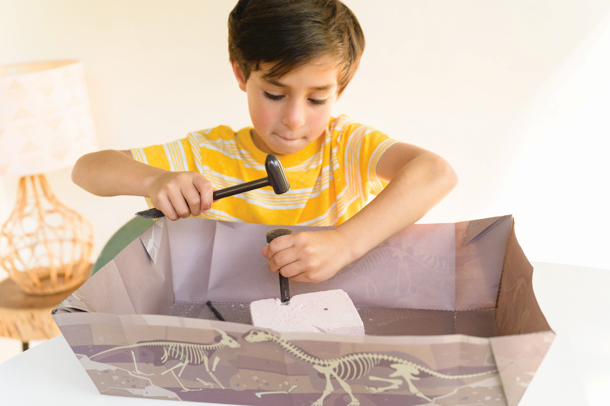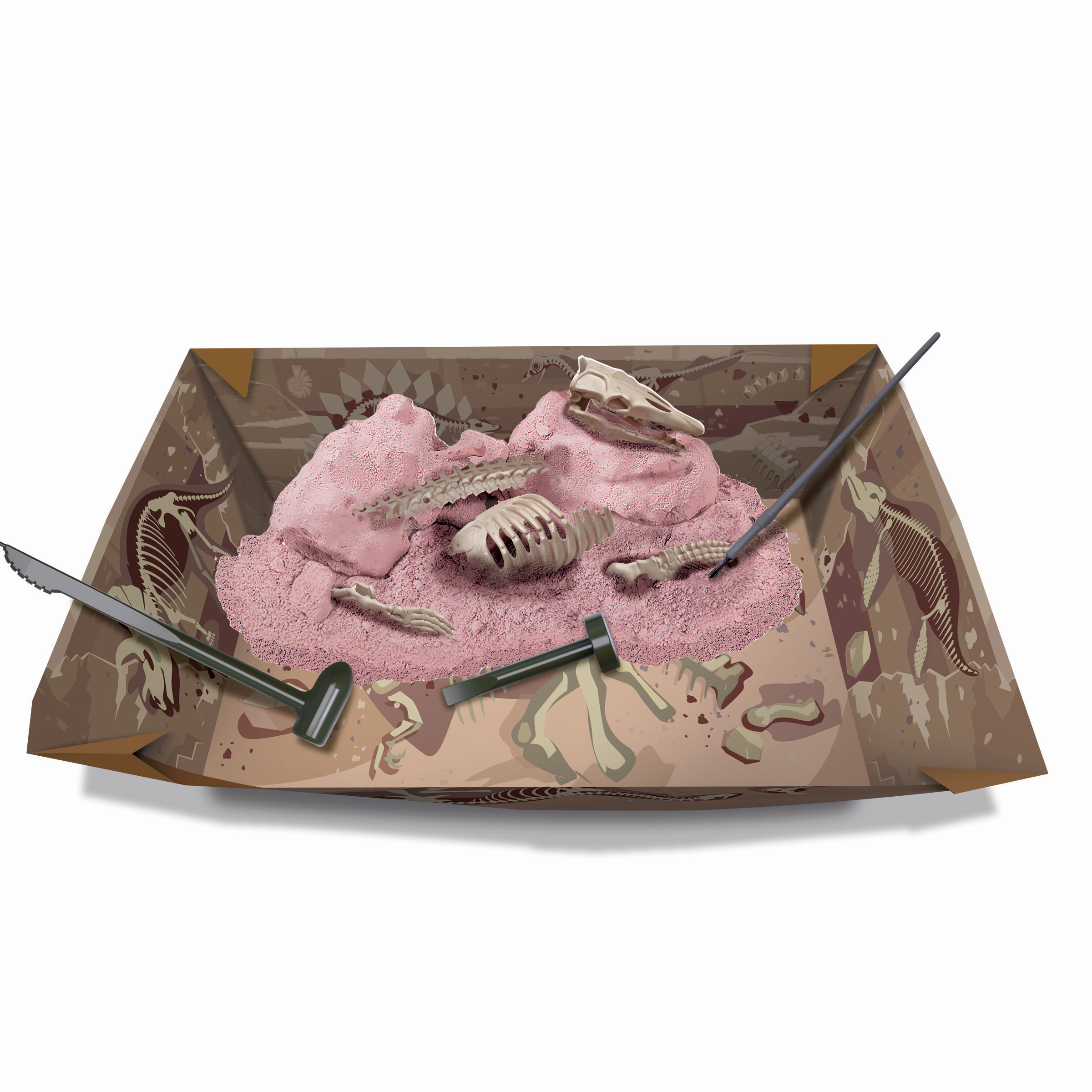Набор юного археолога "Скелет Мозазавра" предлагает с помощью специальных инструментов для раскопок отыскать кости Мозазавра. Гипсовый брикет красно-бурого цвета имитирует слой земли, в котором скрыты тайны древнего мира. Сначала ребёнок производит раскопки - молоточком, скребком и кисточкой он аккуратно расчищает гипсовый брикет, освобождая все косточки. Далее следует увлекательная сборка скелета - в соответствии с наглядной инструкцией ребёнок соединяет кости. Мягкий воск предназначен для придания более жёсткого крепления костям. Он при необходимости легко разминается руками и наносится в места соединений. Собственноручно выкопанный скелет мозазавра готов. Cкелет Мозазавра - это игрушка из абсолютно безопасного, не аллергенного материала, которая развивает воображение и умственные способности ребенка.